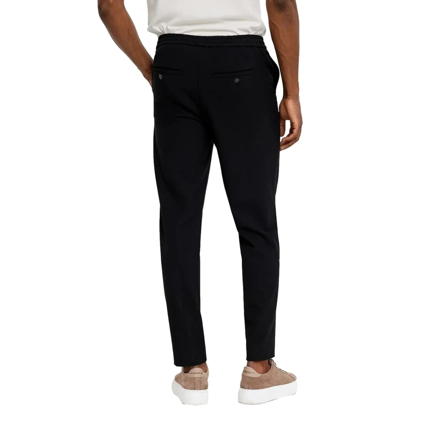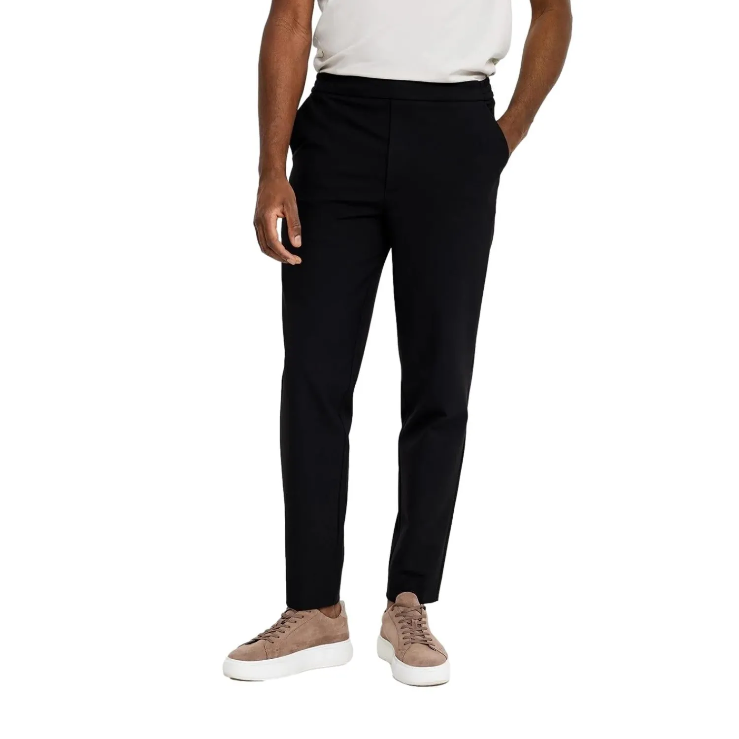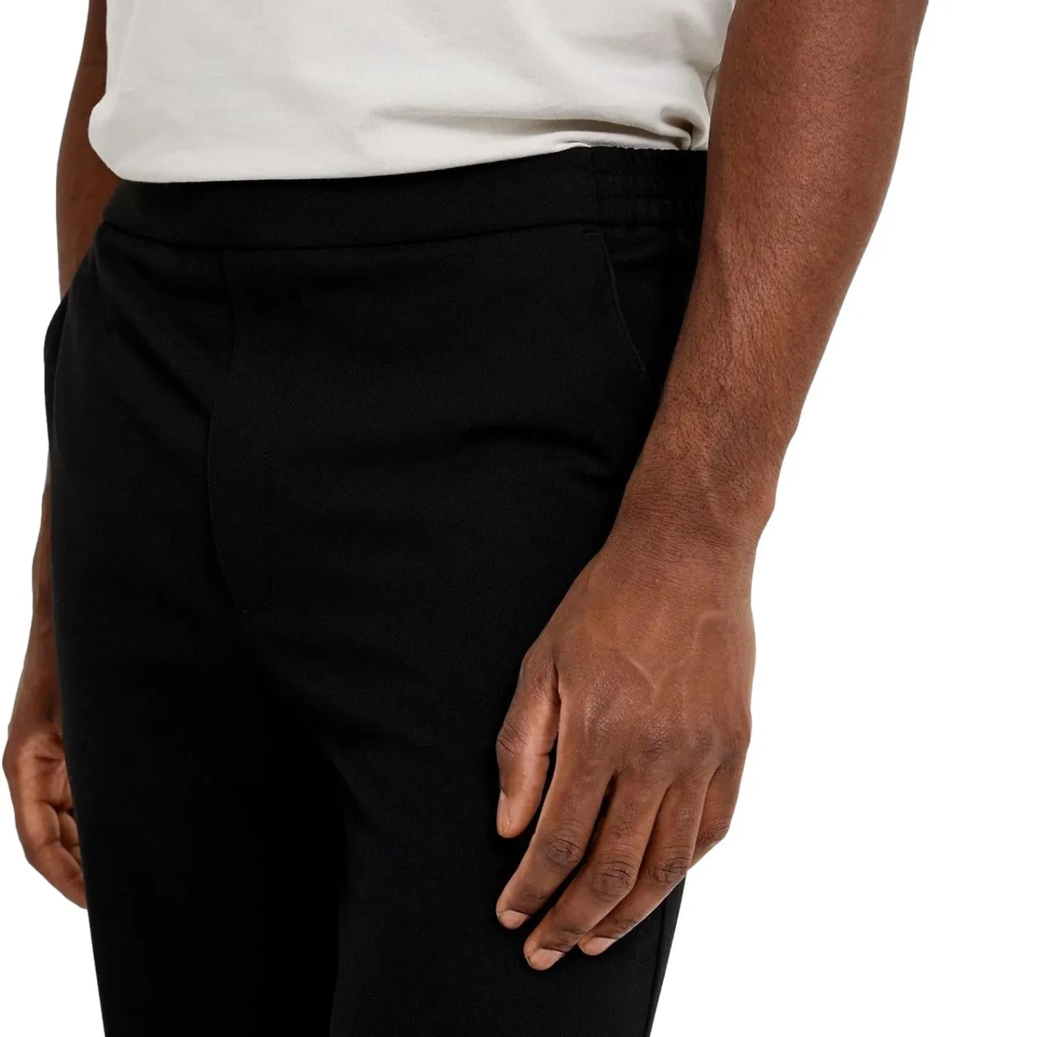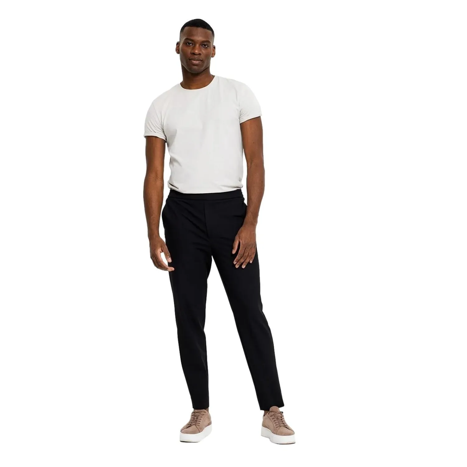 Bukser i rett passform med middels høyde på livet.