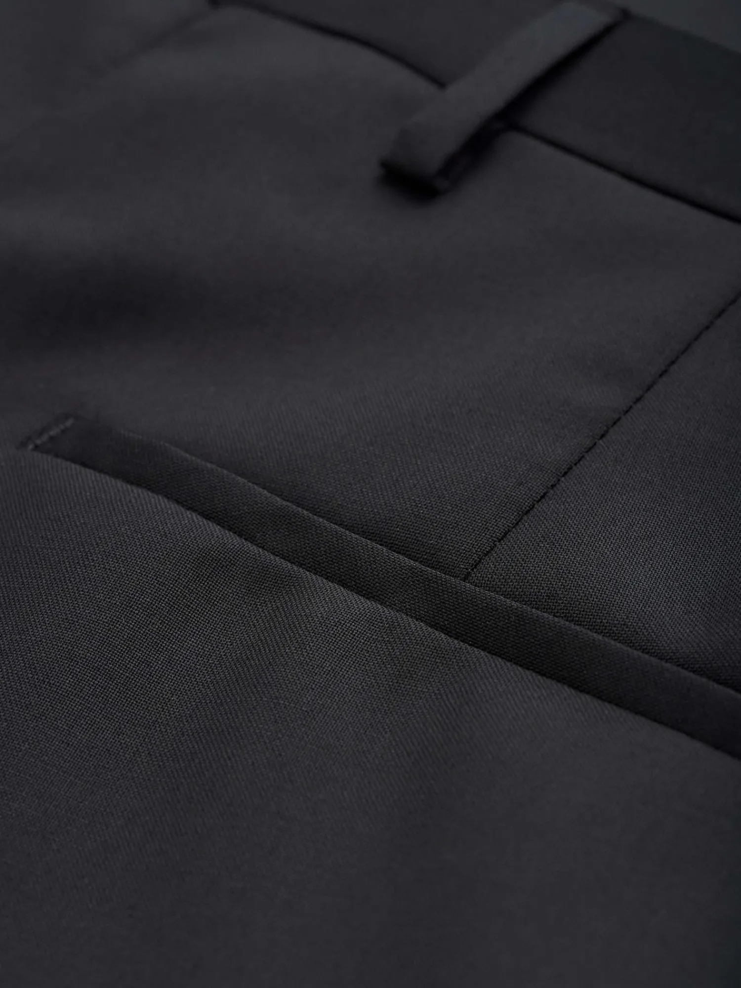 Smokingbukse i smal passform. Middels høyde på livet og smal i leggen. Modellen på bildet er 188 cm høy og bruker str 48.