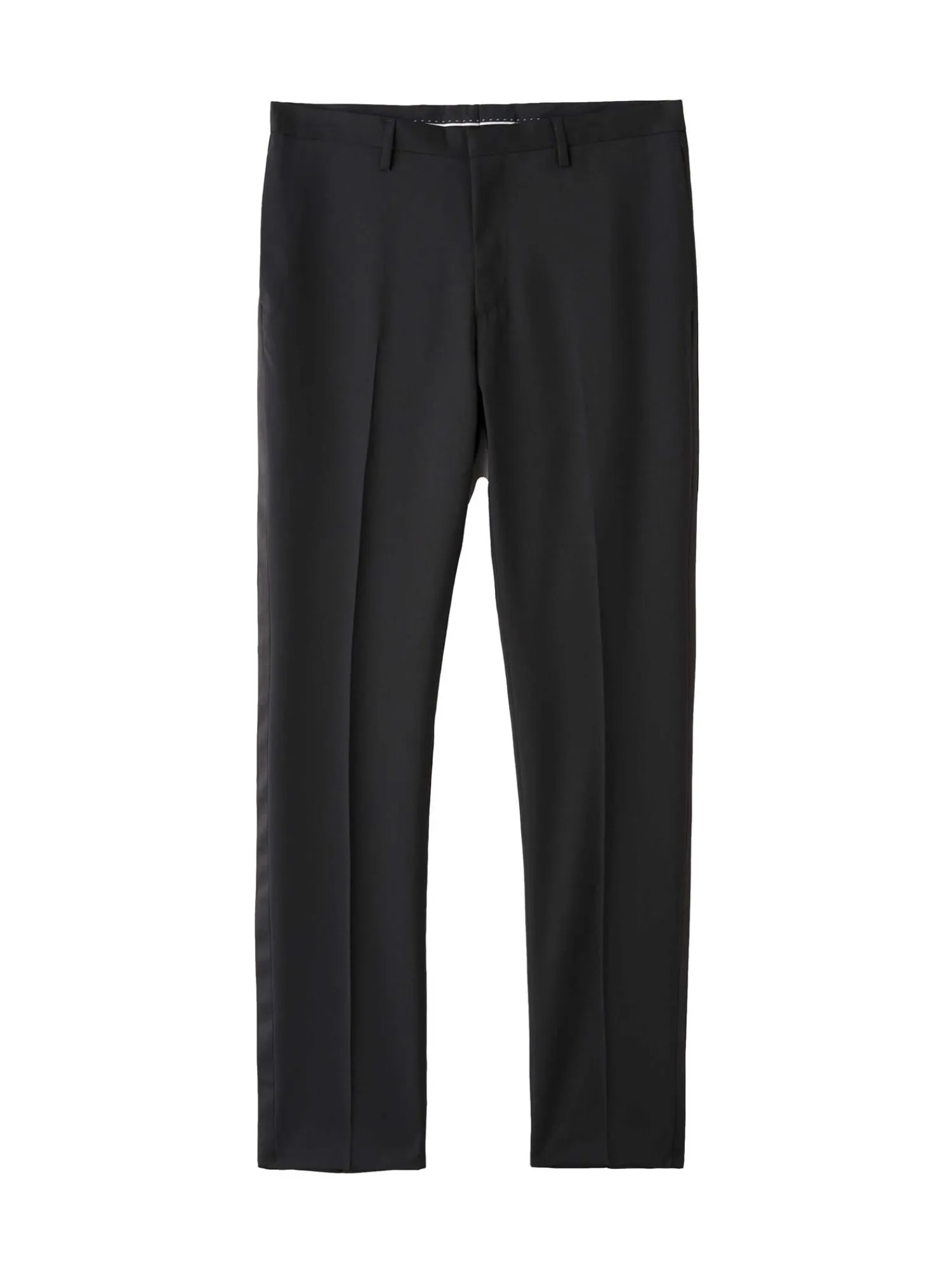 Smokingbukse i smal passform. Middels høyde på livet og smal i leggen. Modellen på bildet er 188 cm høy og bruker str 48.