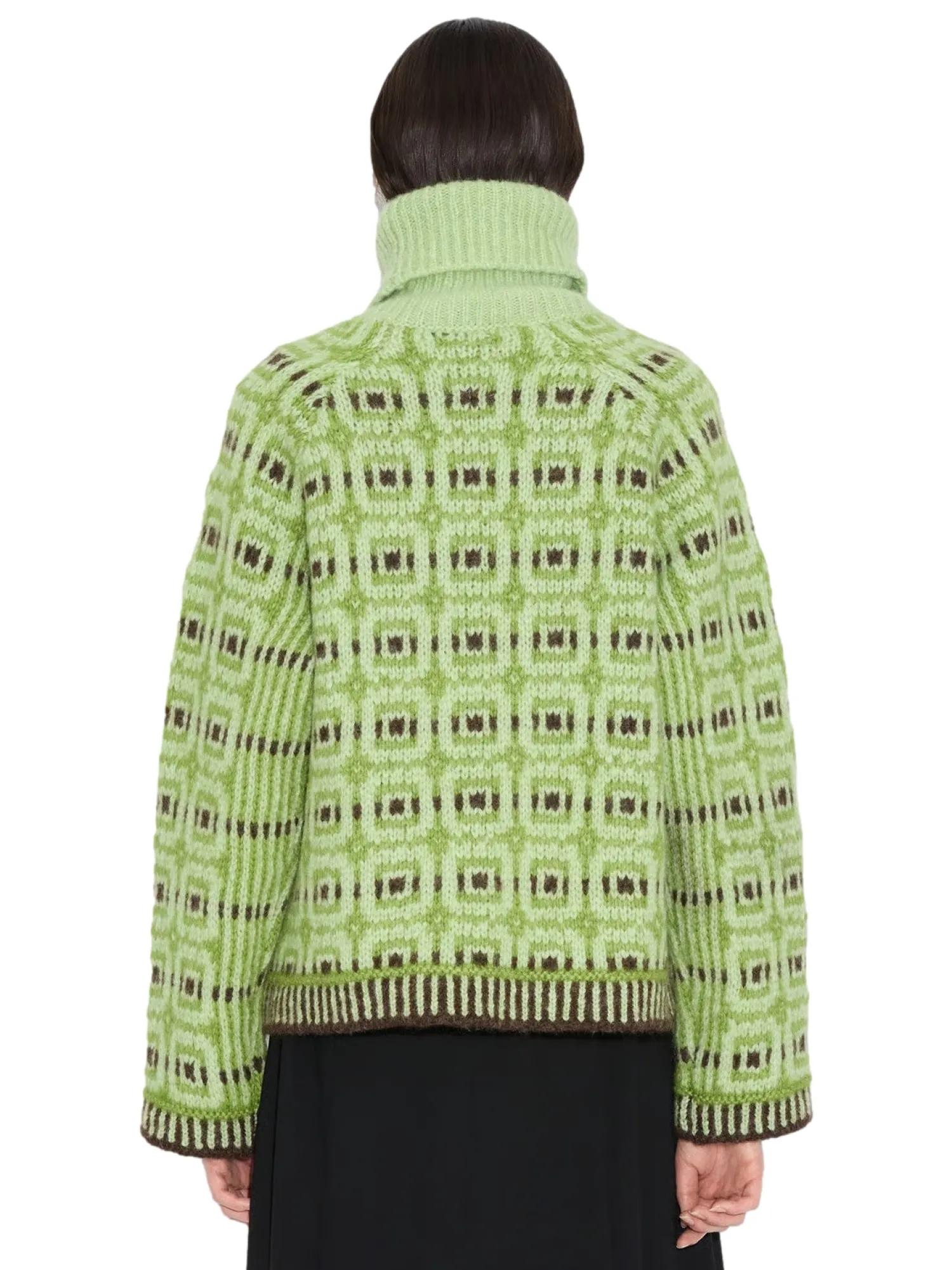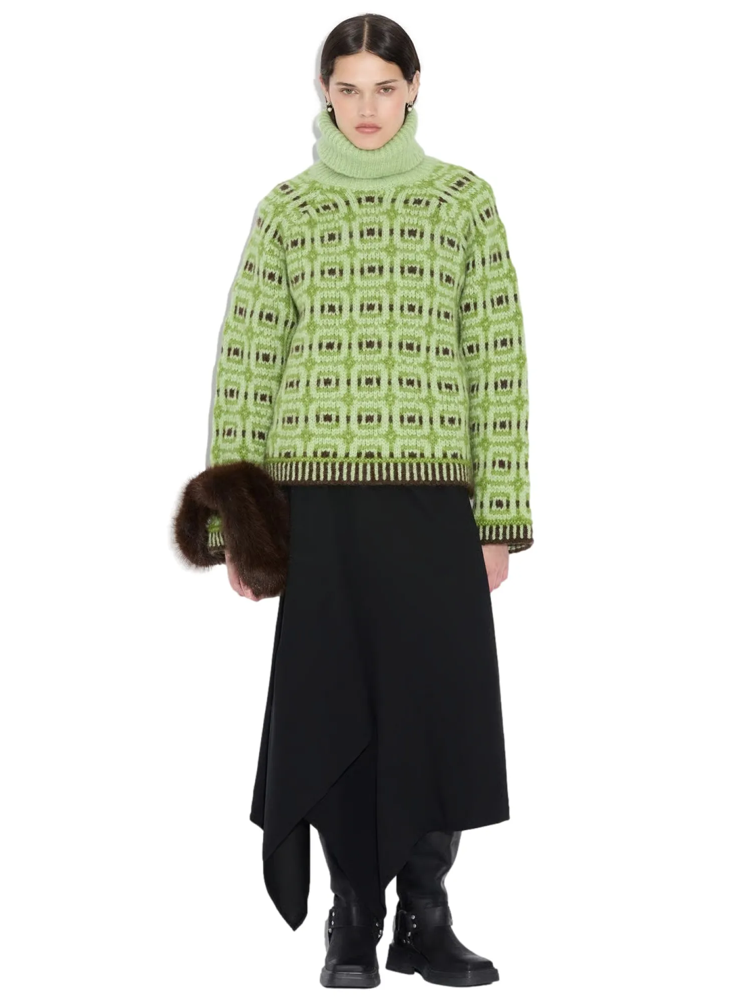 Høyhalset genser i norsk ull er designet i samarbeid med Skappel. Laget av myk norsk lammeull med et heldekkende intarsiamønster, har den en firkantet silhuett med en avslappet passform.