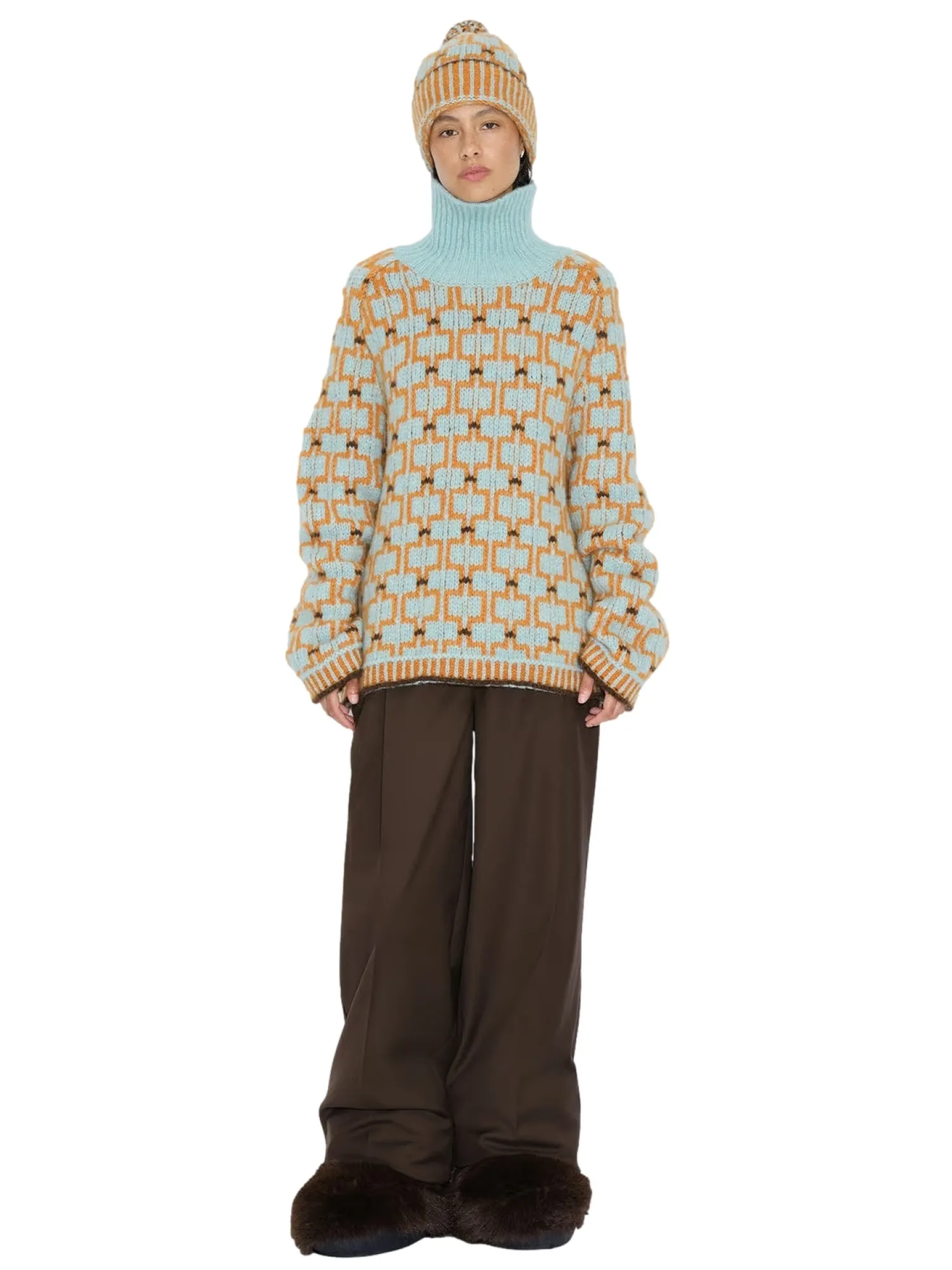 Høyhalset genser i norsk ull er designet i samarbeid med Skappel. Laget av myk norsk lammeull med et heldekkende intarsiamønster, har den en firkantet silhuett med en avslappet passform.