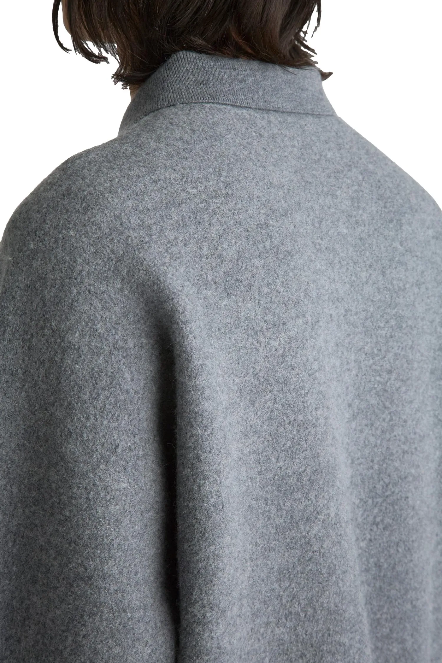 Designet med senkede skuldre, en rett, firkantet passform, med en ribbet kant som henger rett, med splitter i sidene. Avsluttet med en ribbet krage med kvart glidelås.
