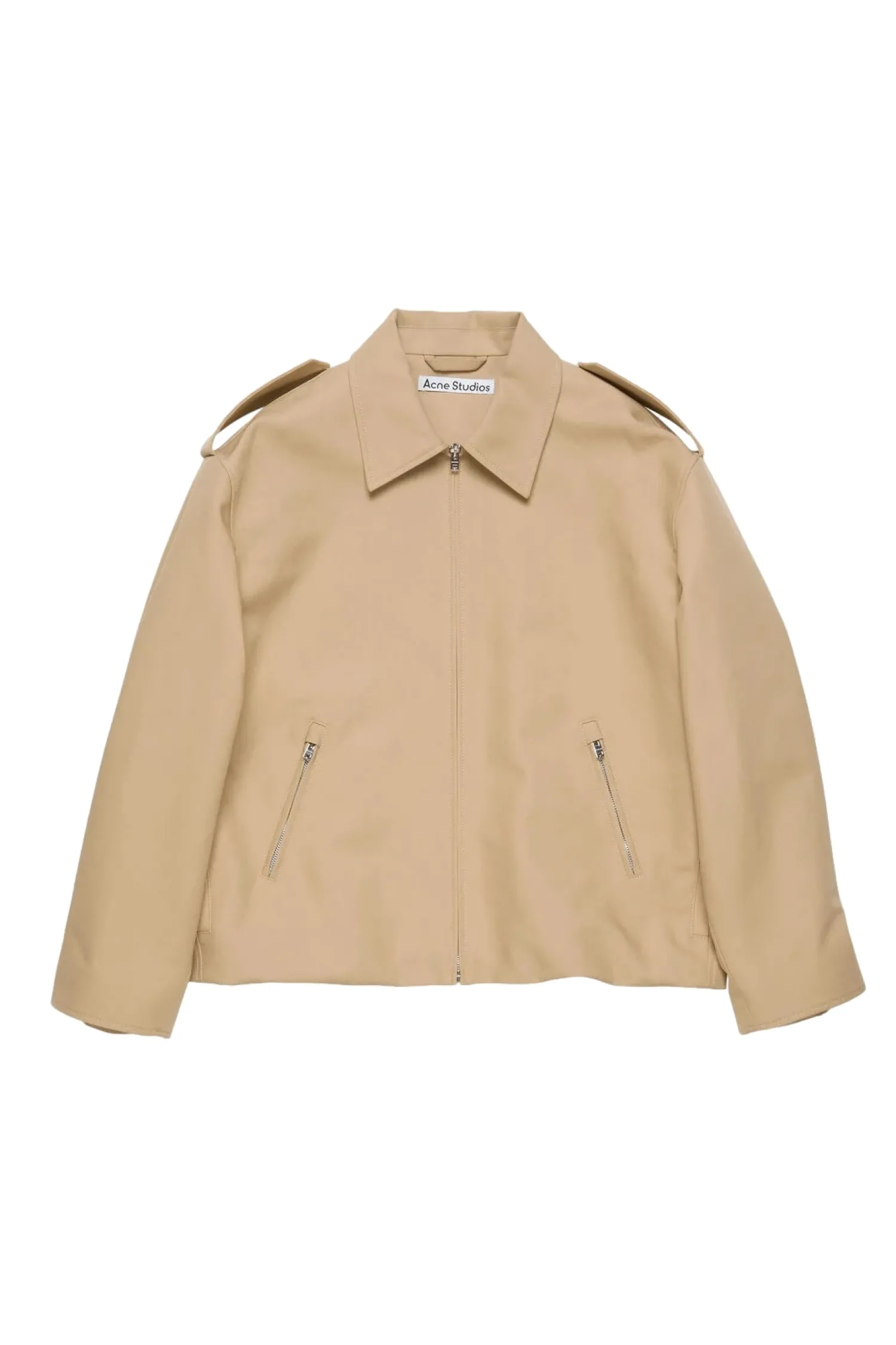 Jakke med krage for alle årstider, laget av glatt bomullssateng og avsluttet med skulderstropper. Har glidelåslukking midt foran og elastisk fald. Detaljert med en Acne Studios-logo i skinn midt bak i halsen. Avslappet passform og hoftelang silhuett.