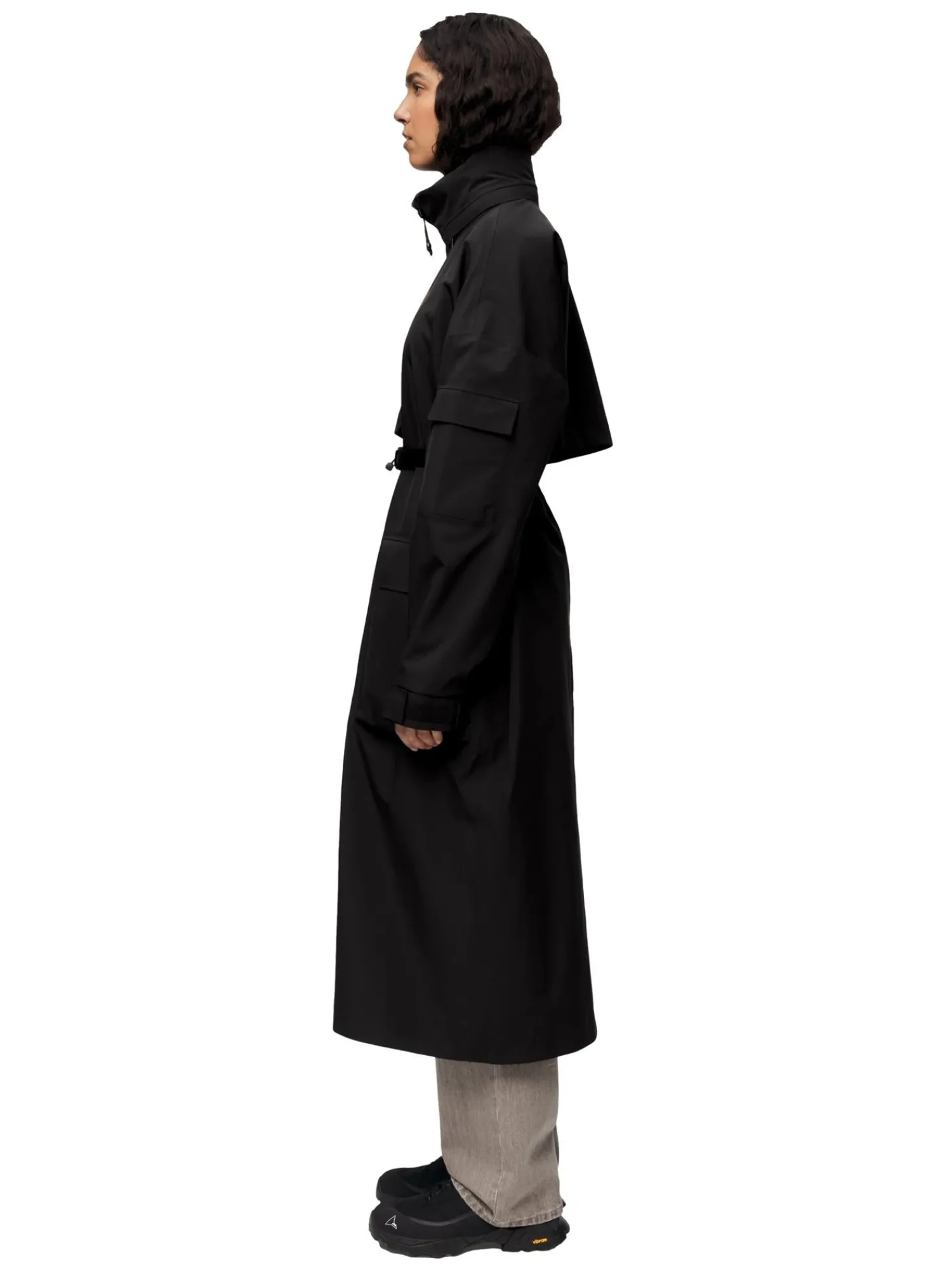 Lang elegant frakk med hette i vann- og vindavvisende stoff.