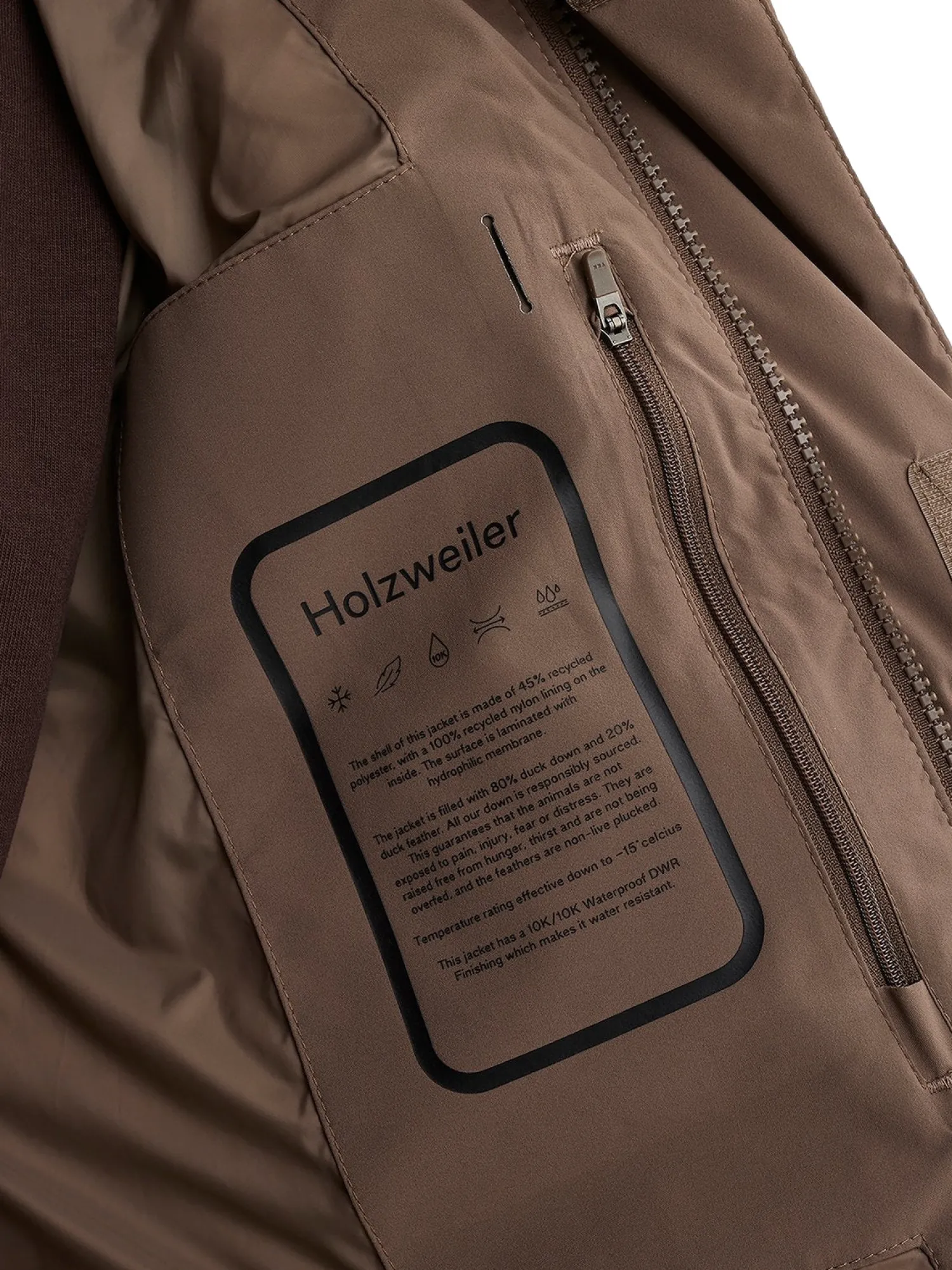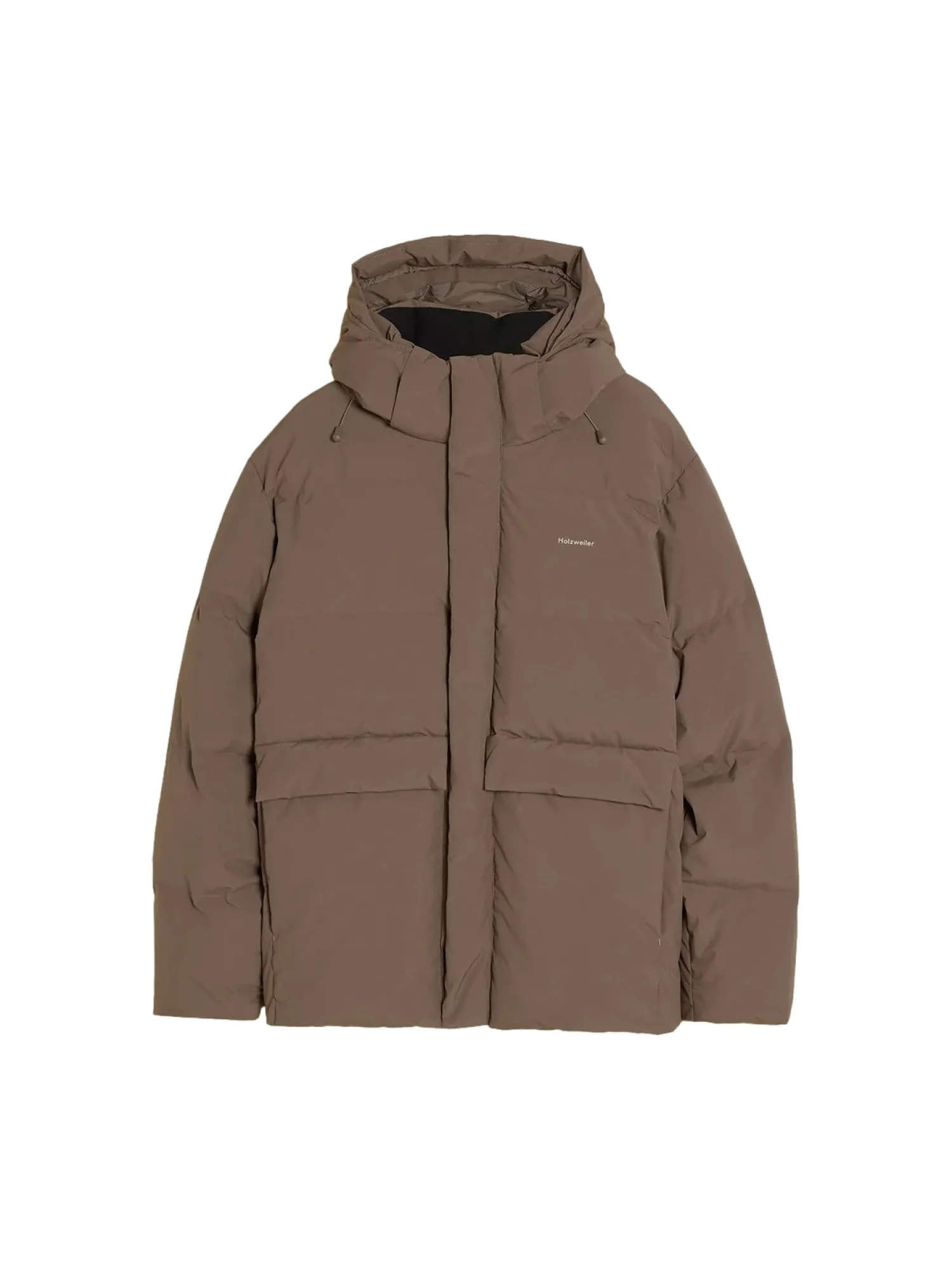 Dunjakke med avtagbar hette i avslappet passform. Store frontlommer og logo på brystet.