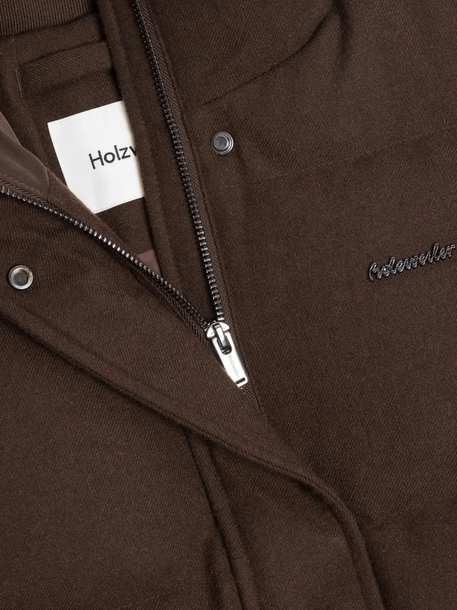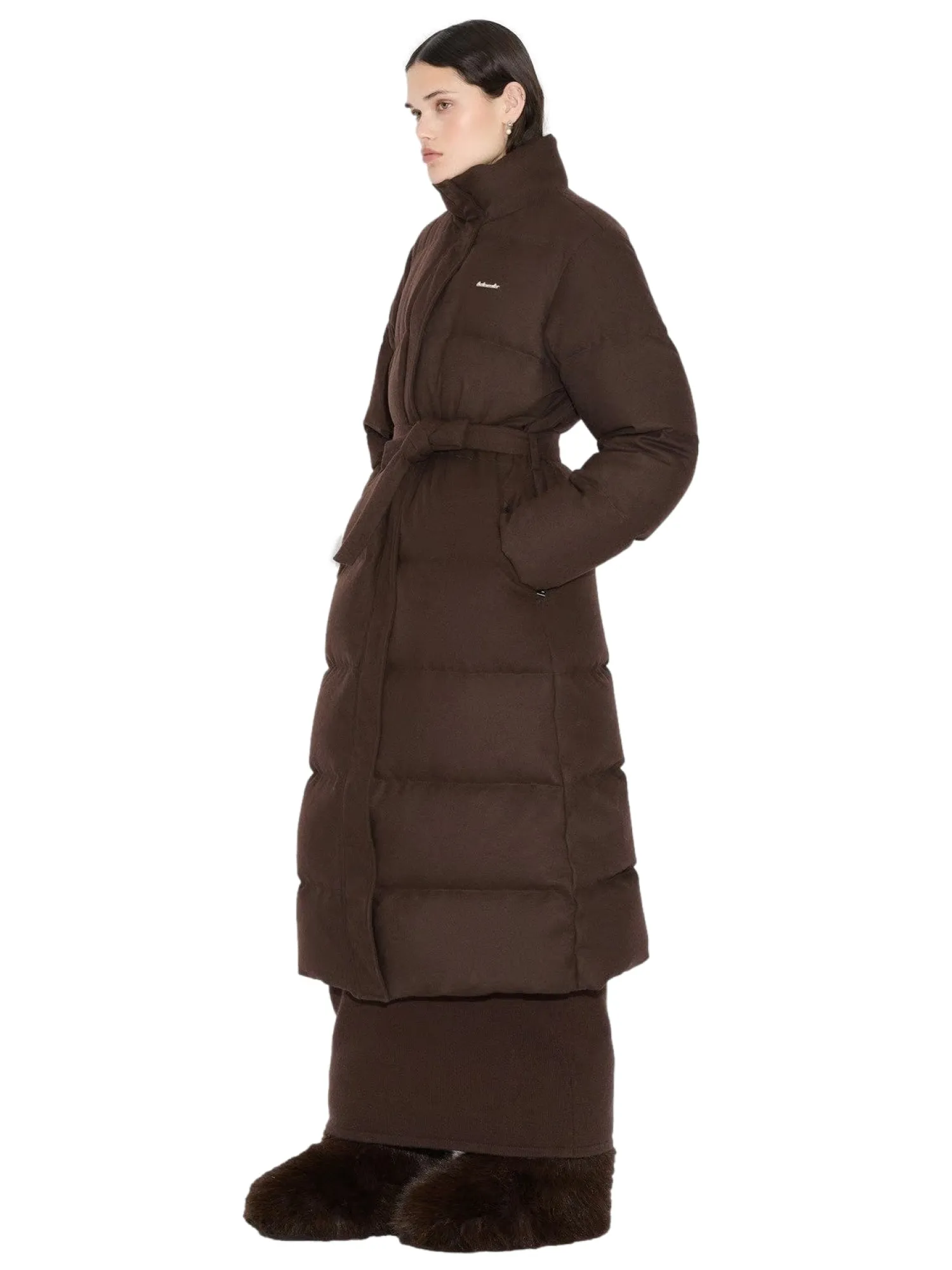 Med en kant som går under kneet og knyteløs midje kan Tech Wool-dunfrakken brukes over kveldstøy for optimal isolasjon. Laget av en teknisk ullblanding og vattert med dun, tilbyr dette designet tekniske funksjoner som inner- og utvendige lommer med glidelås, toveis glidelås foran og høy hals. Den er toppet med en metalllogoplakett på brystet.