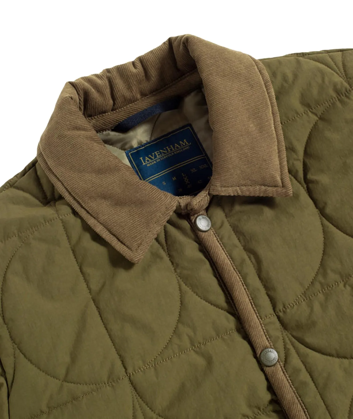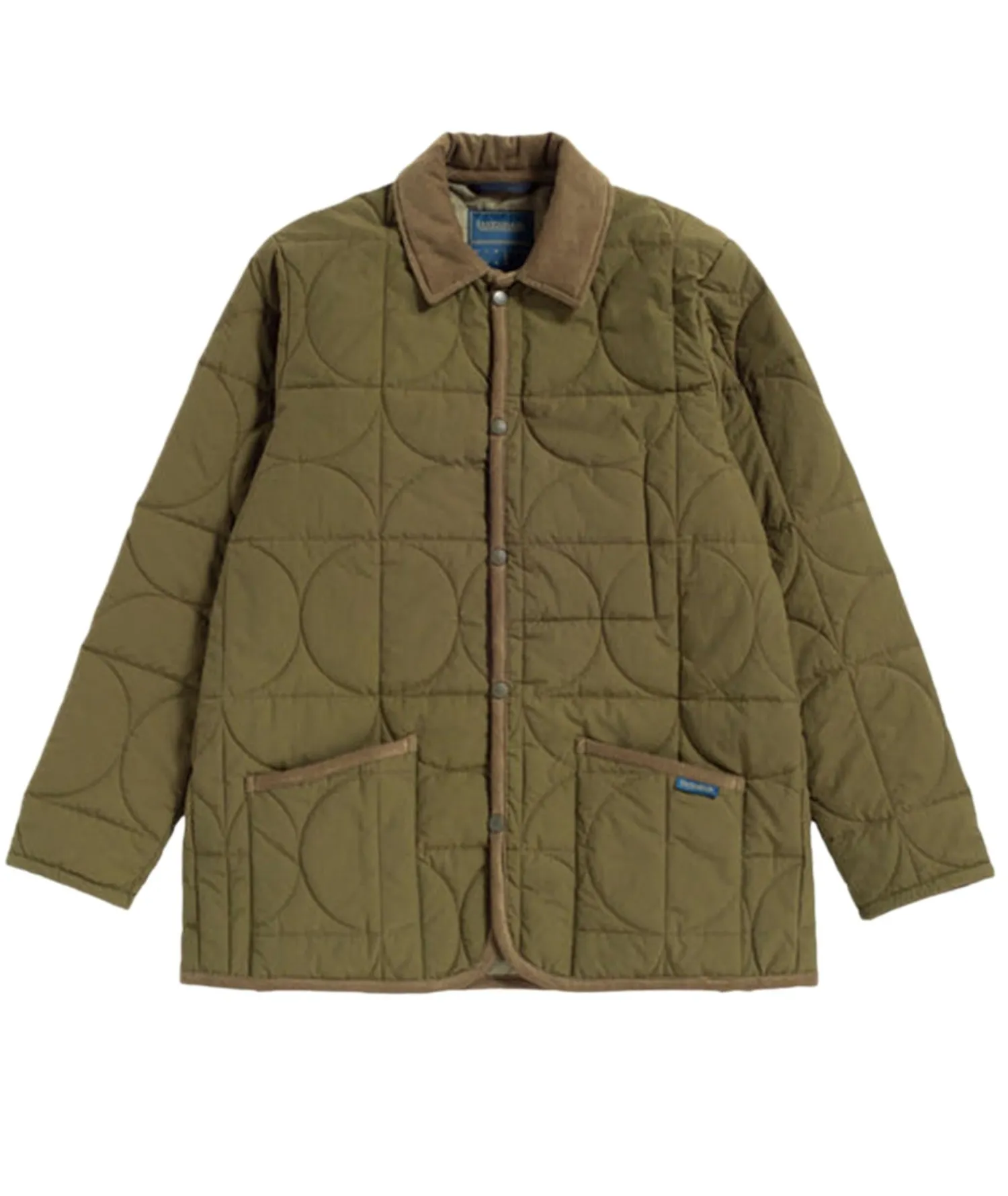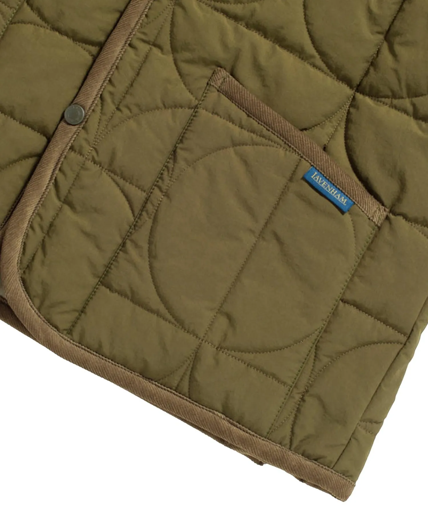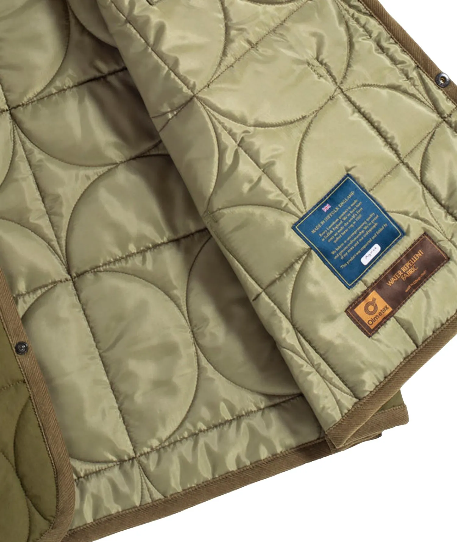 Denham-jakken har en vanlig, rett passform med en innvendig brystlomme og to utvendige lapplommer. Vattert med kompakt vattering for ekstra varme. Stoffet, laget av Olmetex i Italia, kombinerer nylon og bomull for en teksturert, vannavstøtende finish. Jakken er komplett med trykknapper, britisk ulldetaljer og cordfløyelbinding i økologisk bomull.