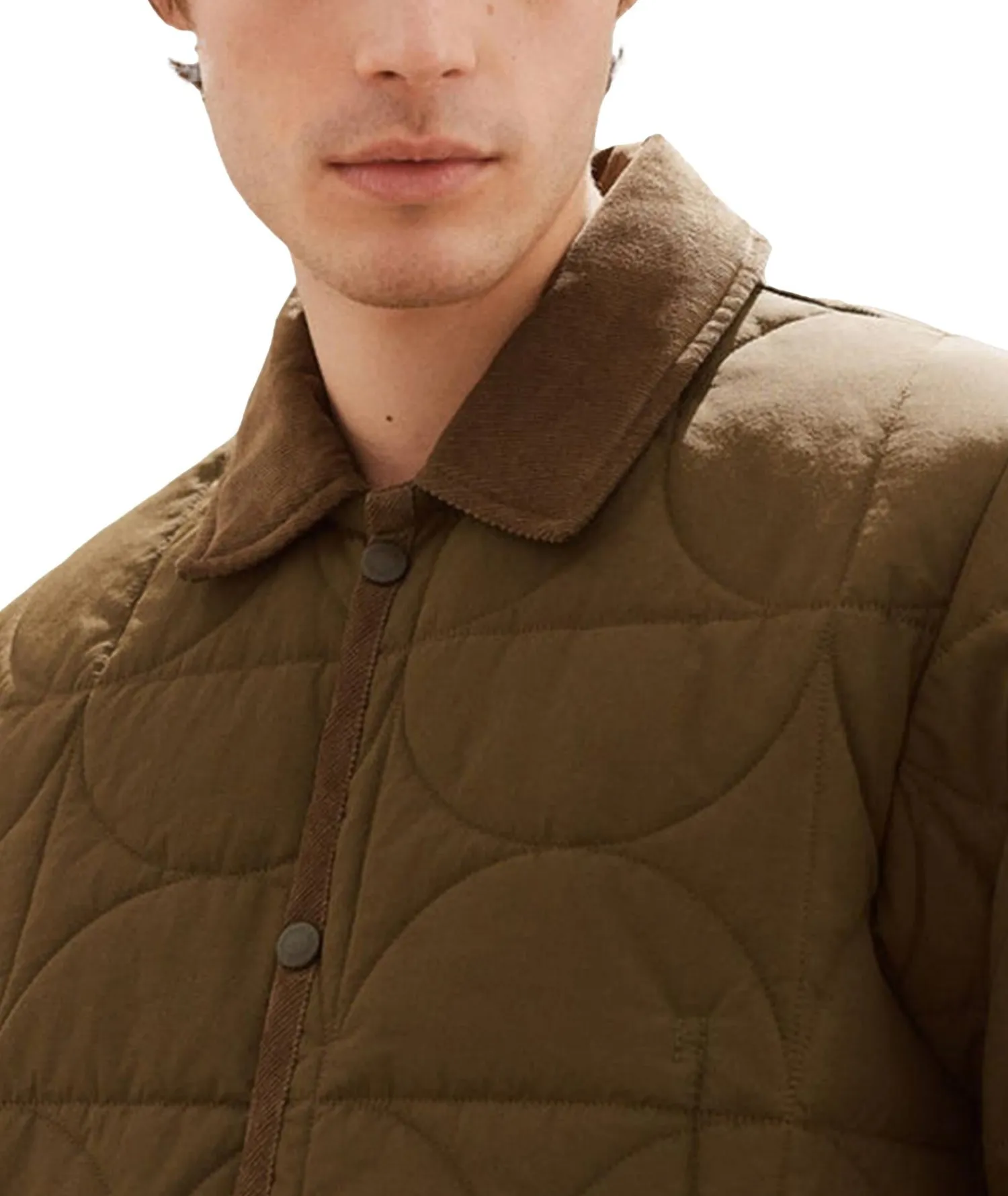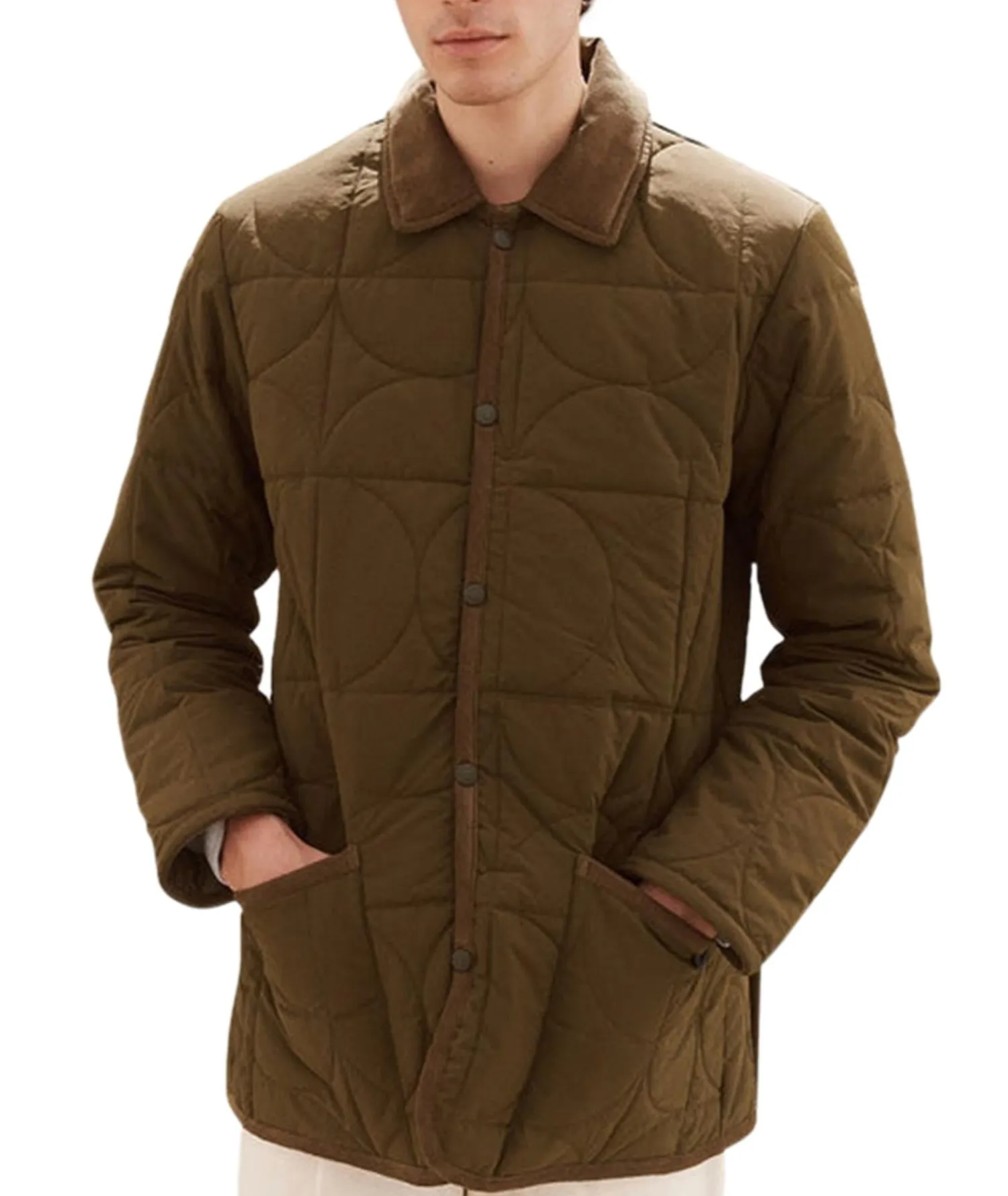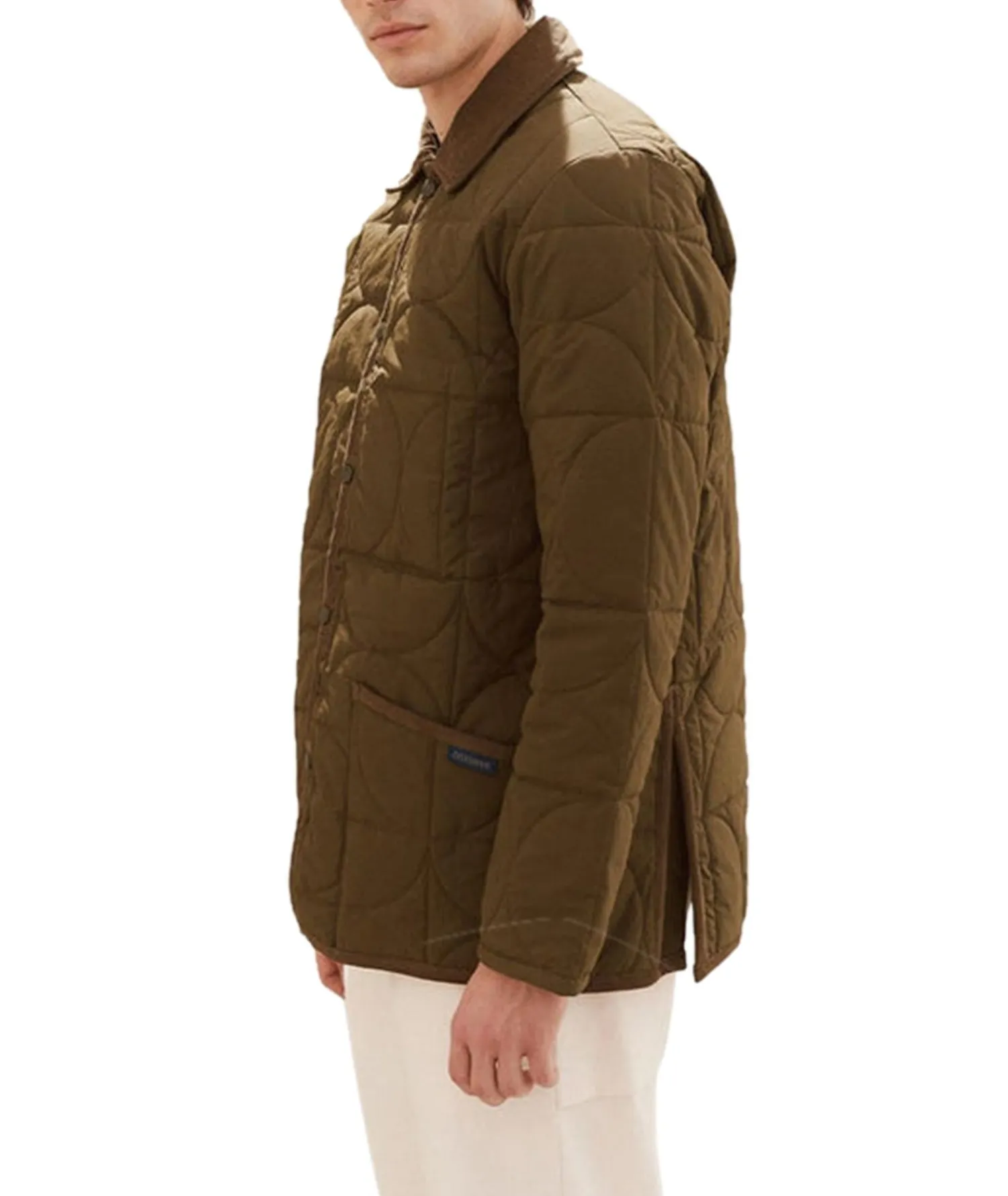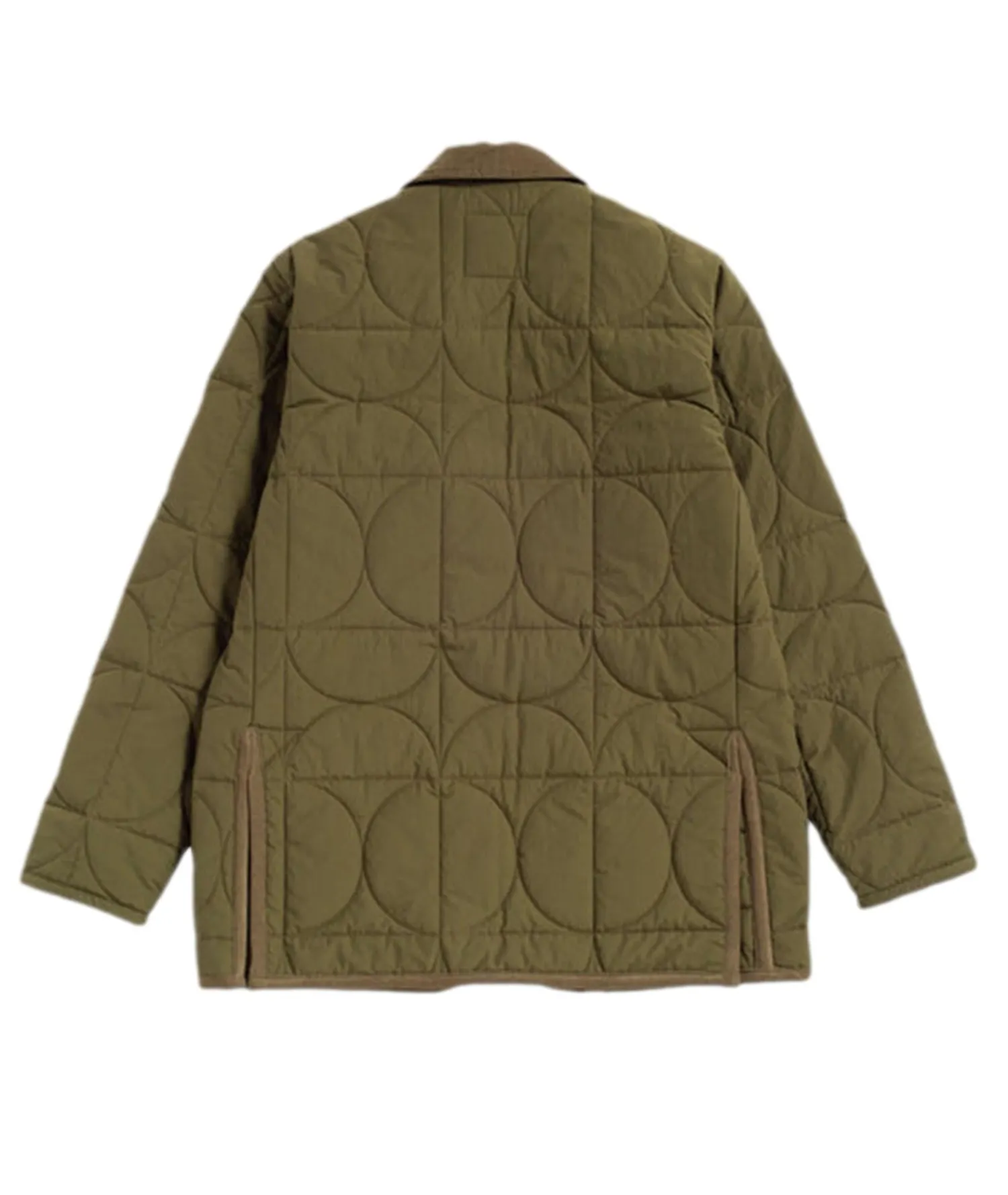 Denham-jakken har en vanlig, rett passform med en innvendig brystlomme og to utvendige lapplommer. Vattert med kompakt vattering for ekstra varme. Stoffet, laget av Olmetex i Italia, kombinerer nylon og bomull for en teksturert, vannavstøtende finish. Jakken er komplett med trykknapper, britisk ulldetaljer og cordfløyelbinding i økologisk bomull.