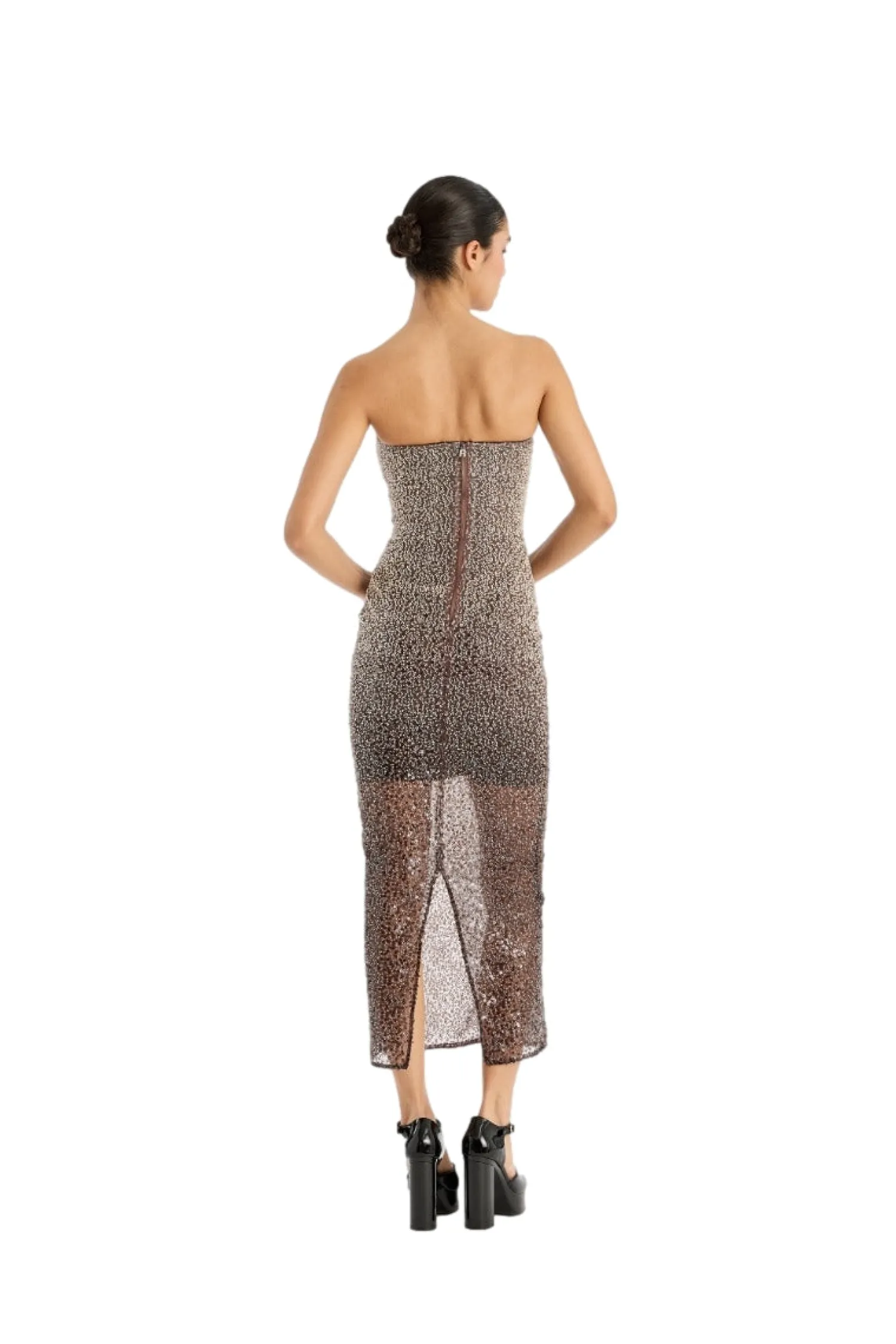 Beaded Midi Tube Dress Brown er en stroppeløs, tettsittende midi-kjole fullpyntet med skimrende paljetter.