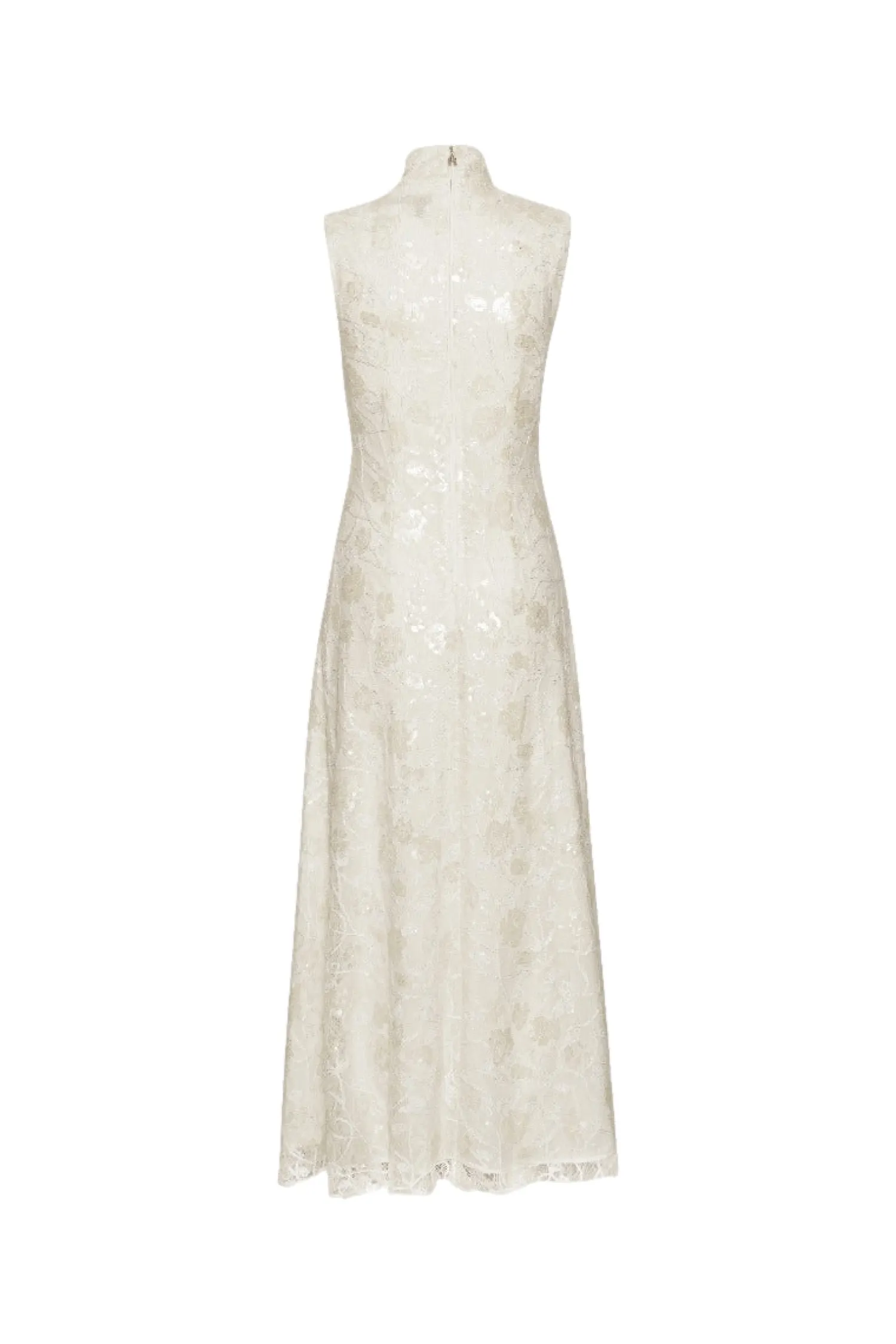 Lang ermeløs kjole med halvhøy hals i regular fit passform.