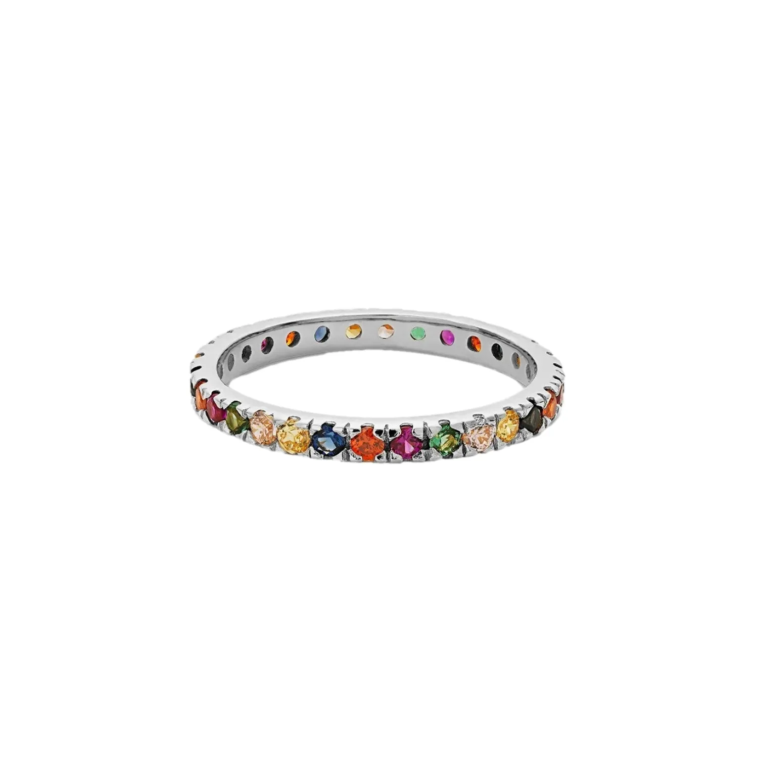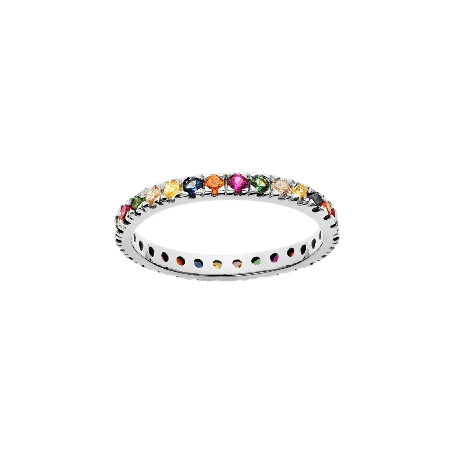 Flott og elegant ring med mange innsatte, fargede zirkoner hele veien rundt. Bær ringen alene eller bruk den sammen med andre ringer.