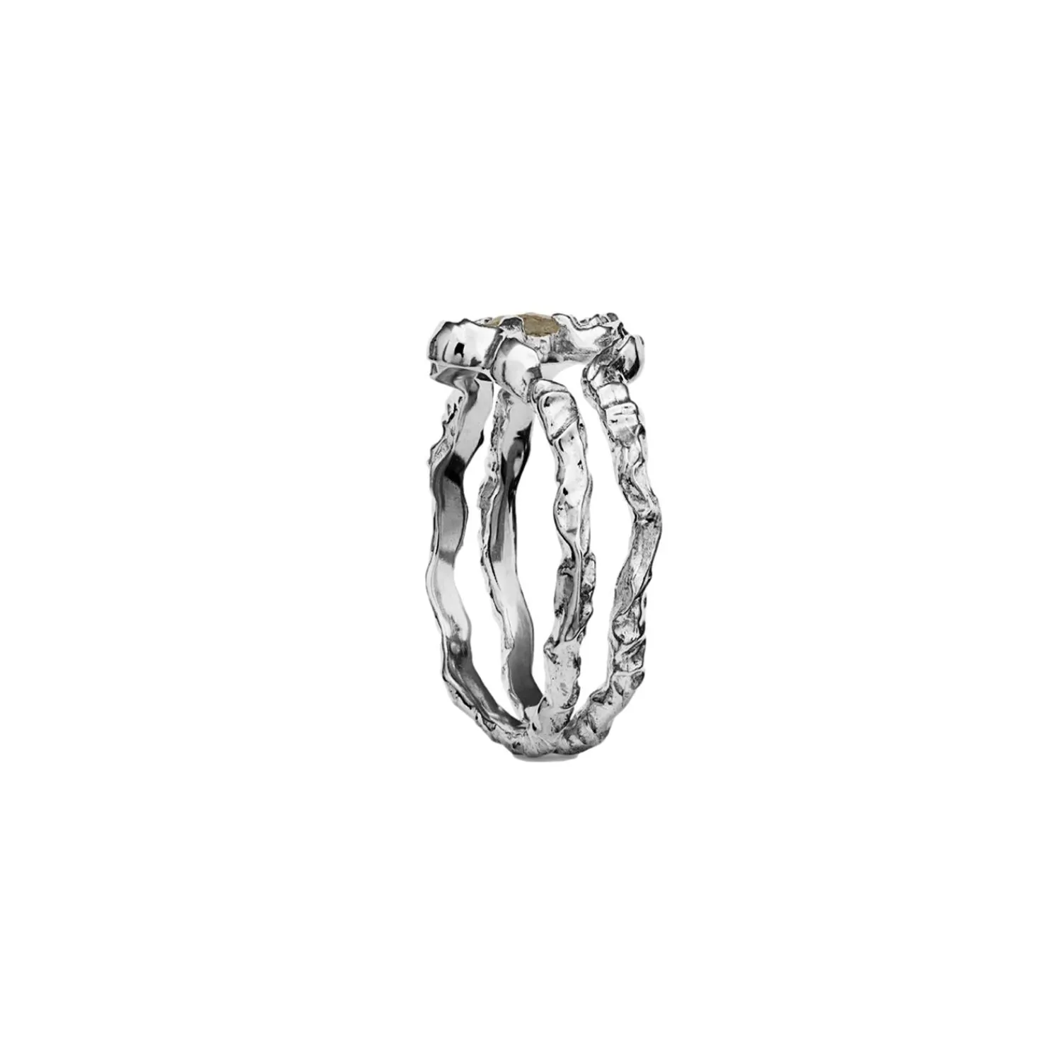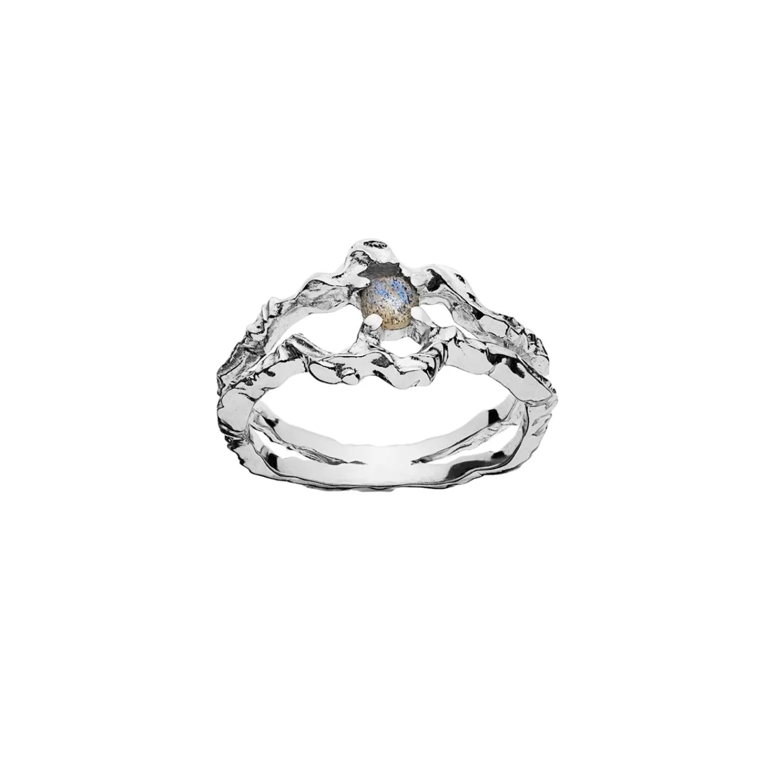 Shelly ringen er en abstrakt musling som gjemmer på en facetteret labradoritt som skaper kontrast til det organiske uttrykket.