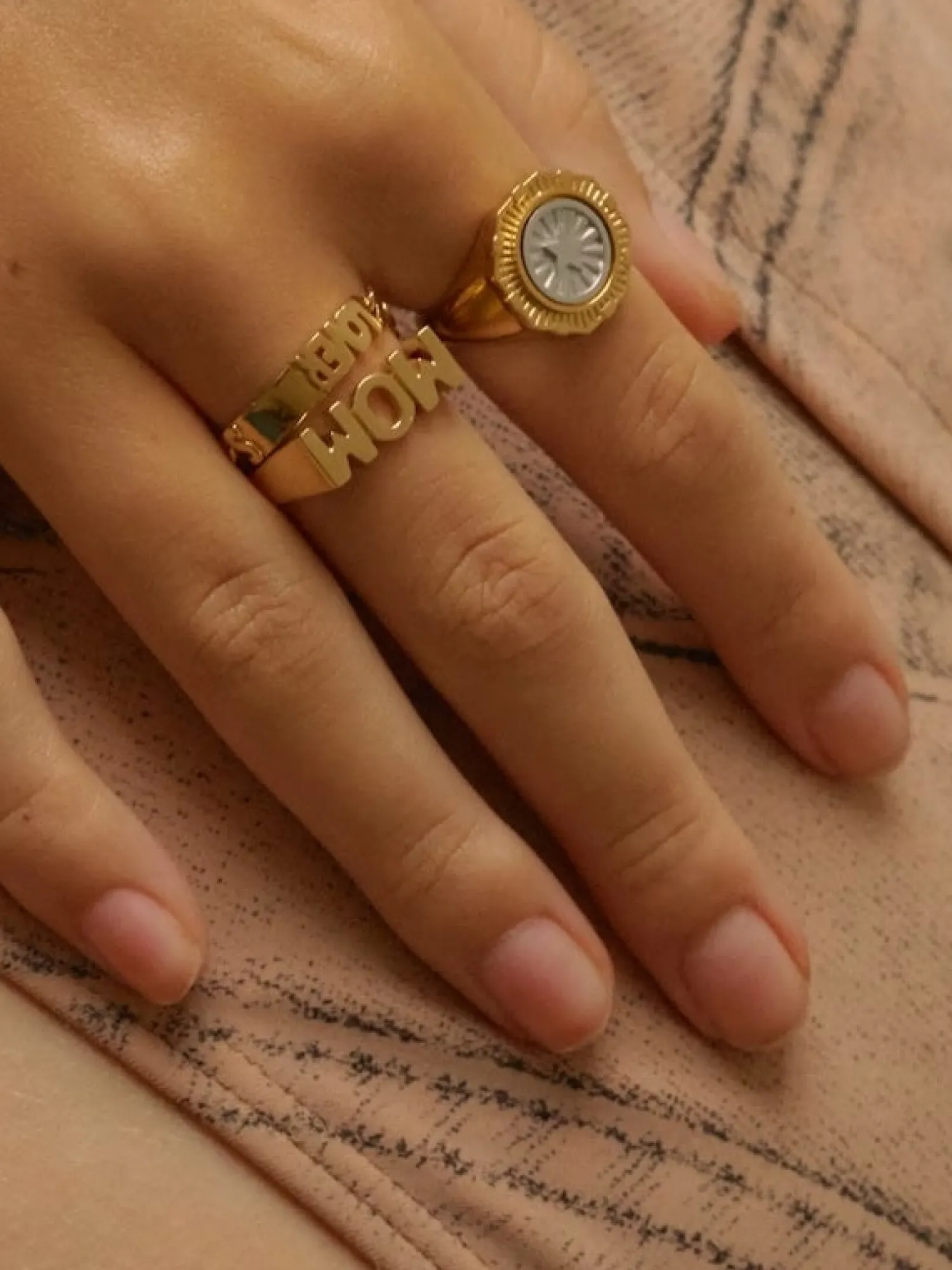 Mom Ring er en hyllest til alle mødre og morsfigurer. Eller som vi liker å kalle dem: moderne helter. Ringen er en del av vår Heroes-kolleksjon som er en feiring av mennesker som minner oss på å følge drømmene våre og å jobbe for det vi ønsker i livet.