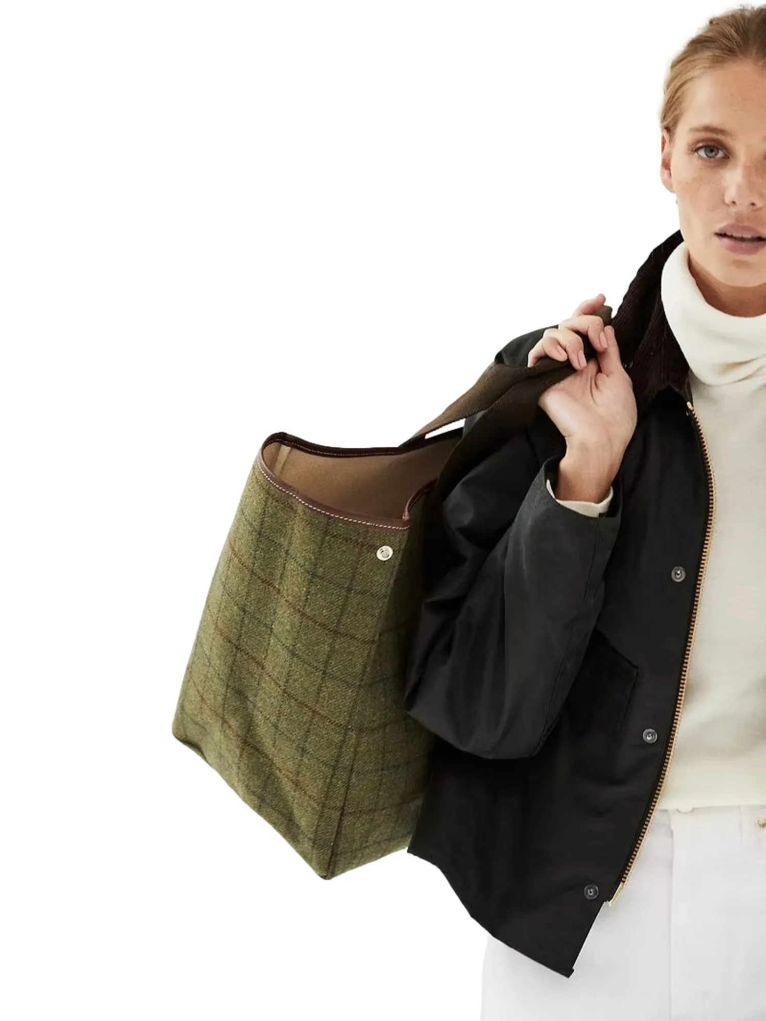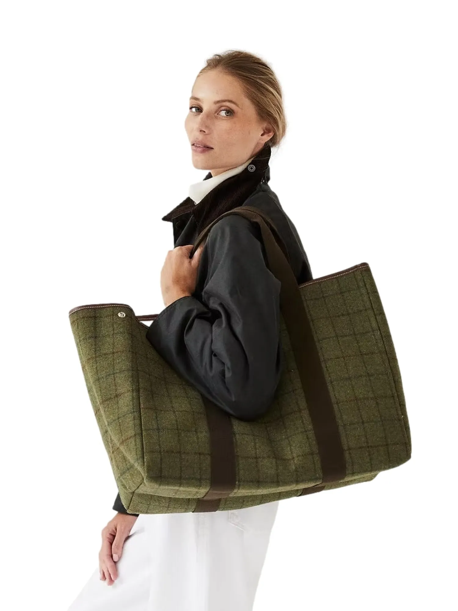 Ekstra stor Traversée Hunting Tweed-veske, inspirert av den historiske britiske jakttweeden, er laget av mønstret khakiull med kontrasterende brune håndtak. Det romslige interiøret passer til alle dine behov og er derfor ideelt for en weekendtur.
