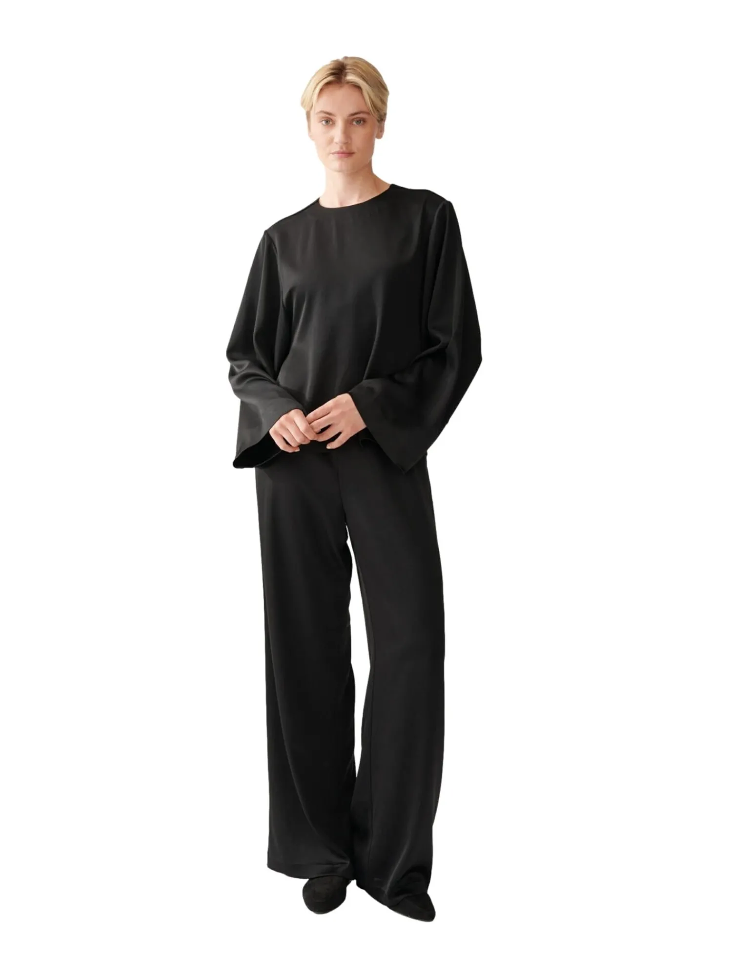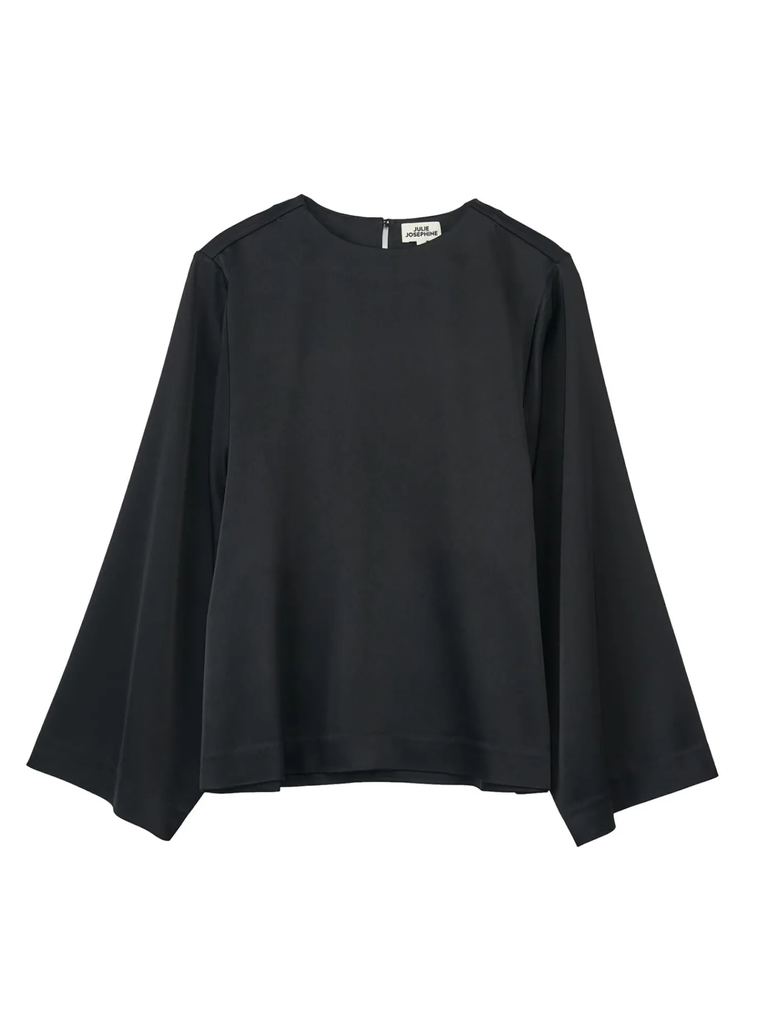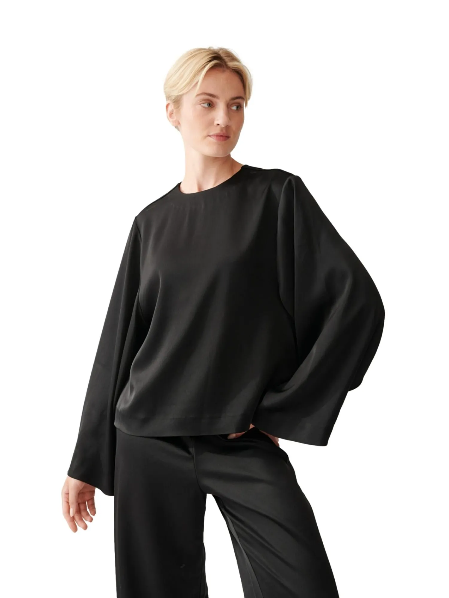 Bluse med rund hals og lange puffete vide ermer.