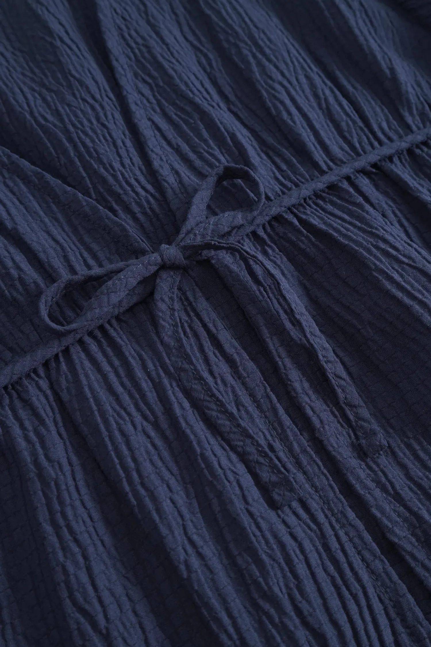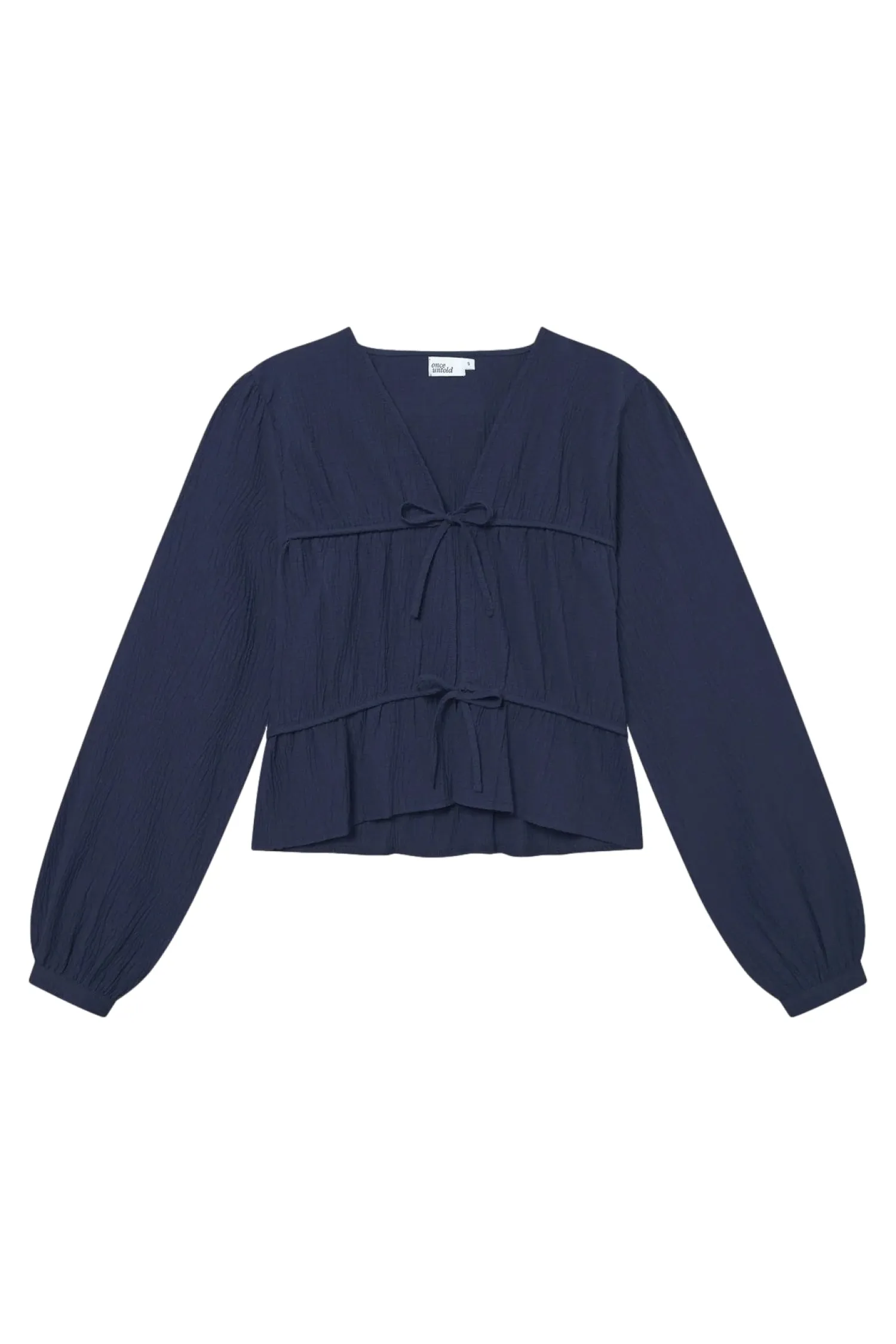 Mercer-strengbluse er en flatterende bluse med dobbel knytedetaljer foran.