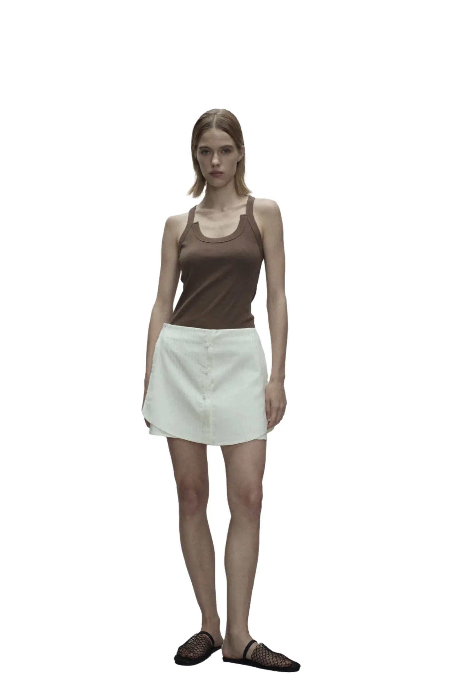 Dette teksturerte stripete korte skjørtet har et subtilt vertikalt linjemønster som gir stoffet visuell interesse. Fronten er knappet opp med små hvite knapper, som skaper en illusjon av en skjorte underdel.