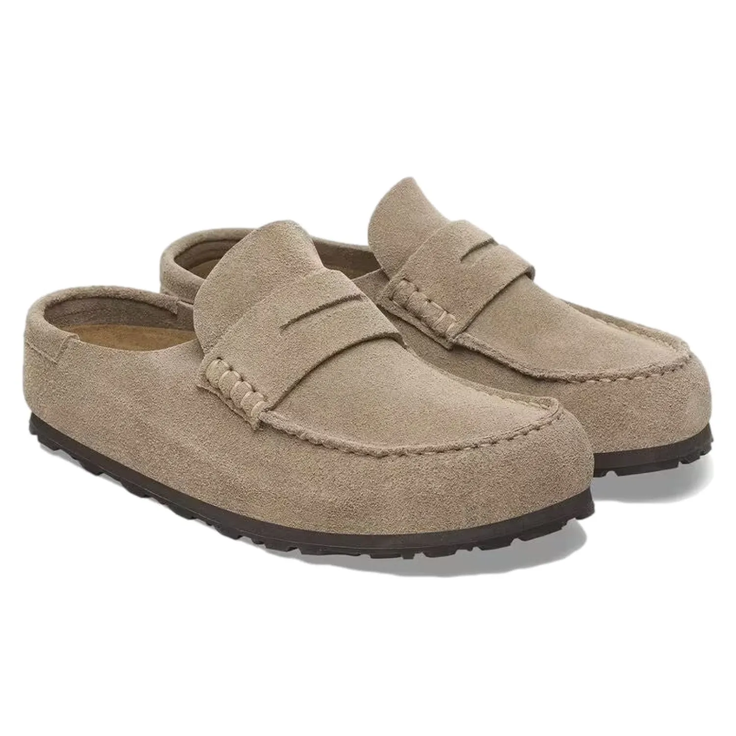 BIRKENSTOCK Naples Wrapped er den lukkede versjonen av den populære halvåpne Buckley-clog. Mokkasinmodellen med iøynefallende sømmer gir denne sandalen et særegent og maskulint utseende. Takket være de to komponentene gir sålen et fast og komfortabelt fotfeste. Den består av en dempende mellomsåle laget av EVA og en yttersåle laget av ekte gummi. Den naturlige designen går helt ned til overdelen laget av spesielt mykt semsket skinn, som omslutter foten som et andre hudlag.