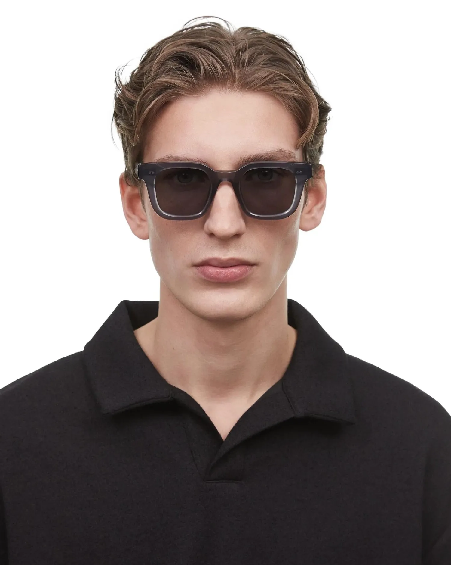 04 er en stilistisk silhuett som skaper dynamisk kontrast med en sterk rektangulær ramme og slanke sider. Ferdig med sølvfargede naglehengsler og dype skråsnitt langs de UV-beskyttende, flate CR39-linsene.