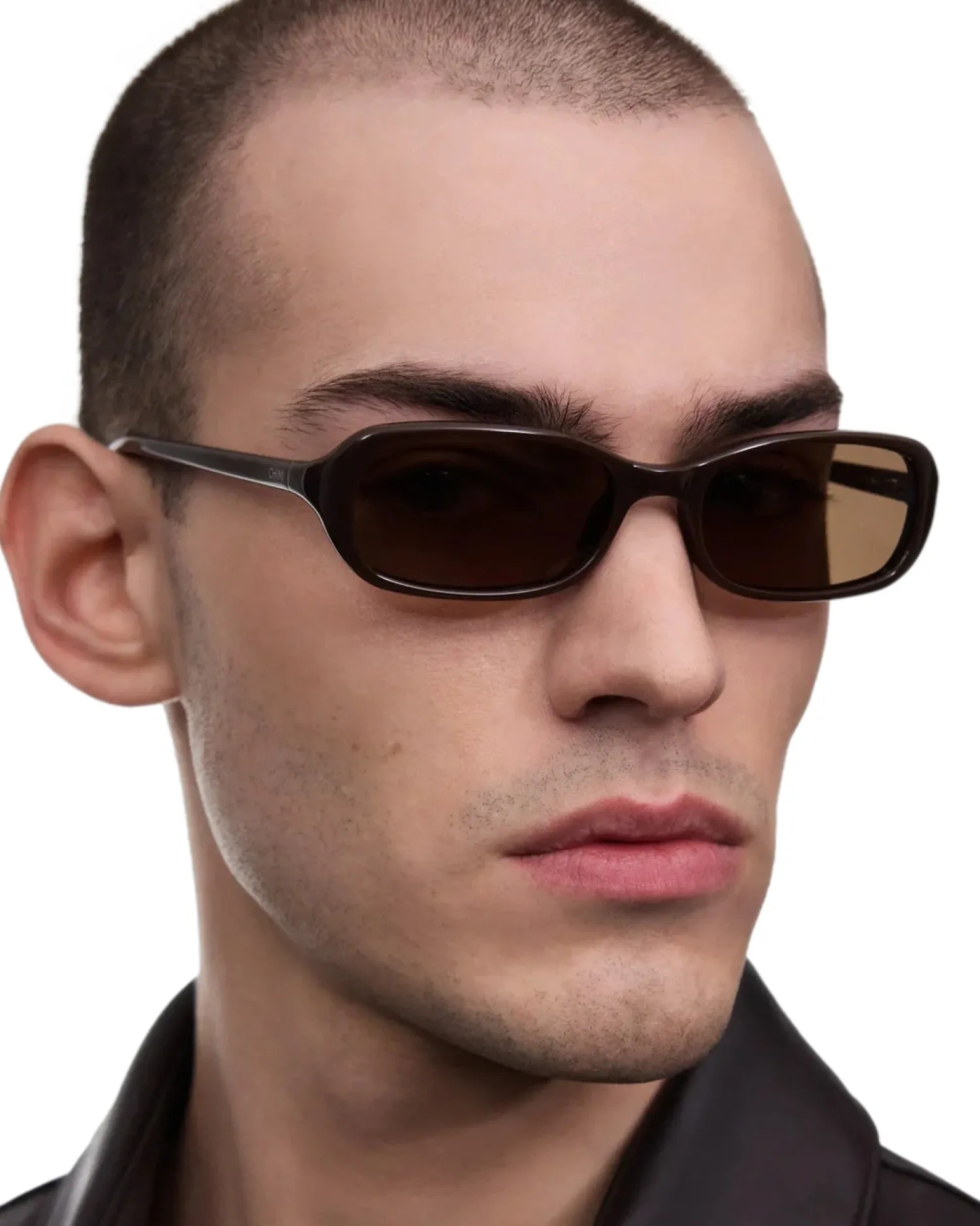 Code er en elegant oval silhuett med en utpreget lett profil og slanke stenger, signert med sølvmetall-merking på hver side. Håndlaget i premium Acetate Renew™, sammensatt av 42 % biobasert og 28 % sertifisert resirkulert plast.