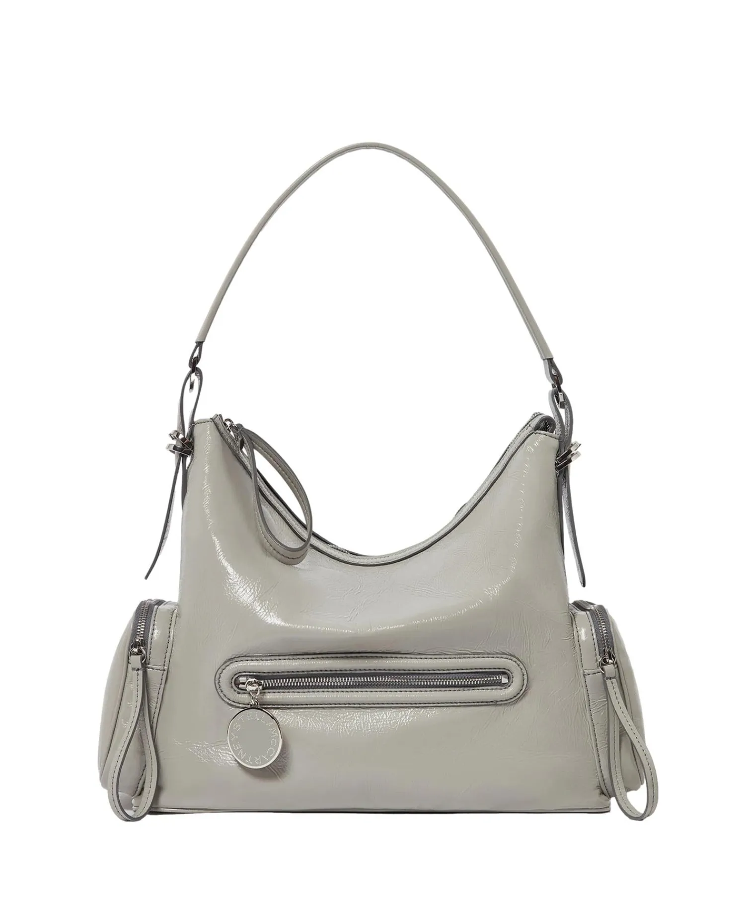 Stella McCartneys Dartmoor-familie introduseres for vinteren 2025. En moderne silhuett med flere lommer som refererer til 00-tallet. Skuldervesken er håndlaget i Italia av veganske alternativer til animalskinn med en krøllete, metallisk finish.