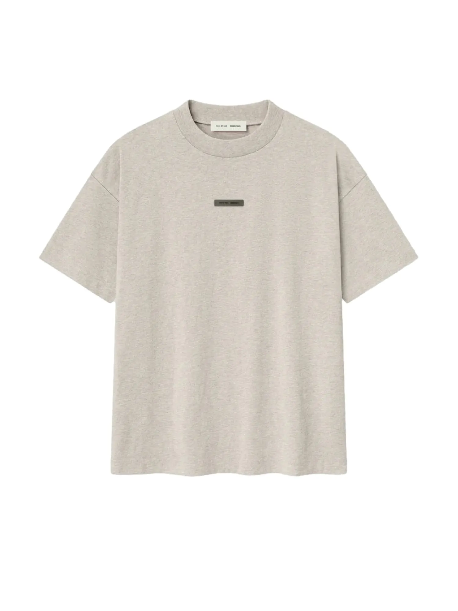 Den klassiske t-skjorten er laget av middels tung 100 % bomullsjersey. Den ribbestrikkede t-skjorten med rund hals har en klassisk passform med de avslappede Fear of God-proporsjonene som er egnet for hverdagsbruk. Merket inkluderer en gjennomsiktig gummiert etikett med teksten «Fear of God Essentials» midt foran og en ny metallisk logo med skråkant «Essentials Fear of God» på baksiden.