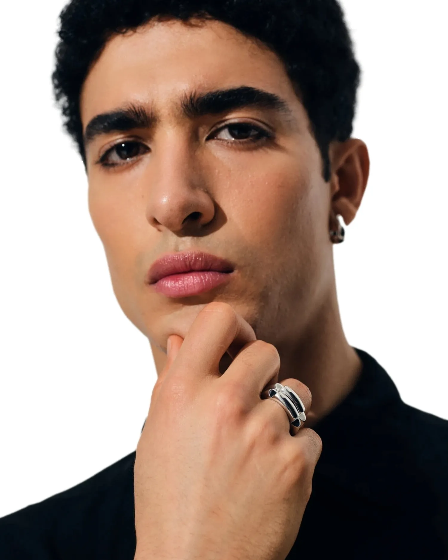 En dristig og moderne båndring med myke kurver som minner om havbølger, kombinert med kontrasterende utskjæringer som ligner gruver der diamanter og edelstener finnes. Inspirert av den berømte Kimberley-gruven i Sør-Afrika, er ringen et bevis på råvarenes tidløse natur.
