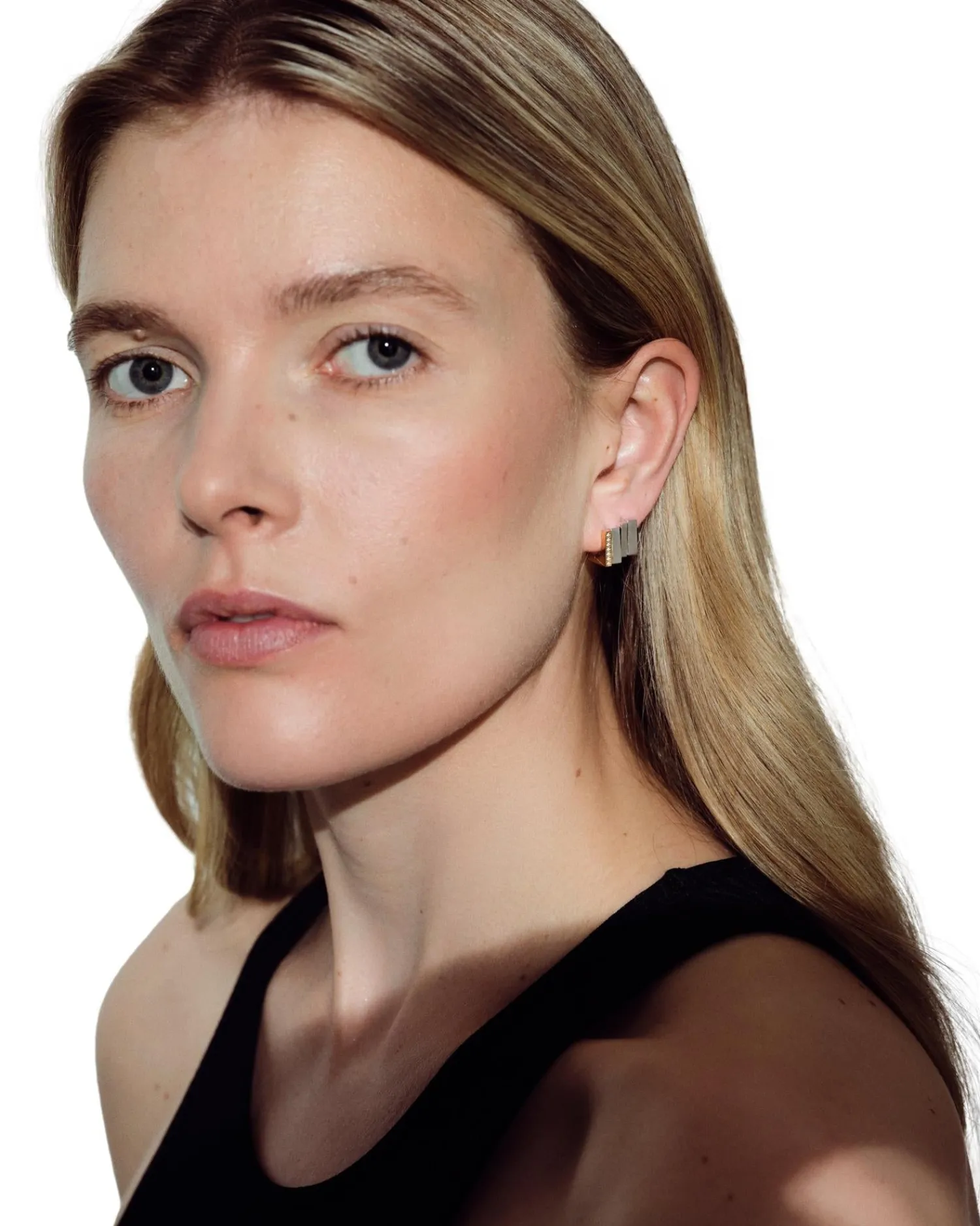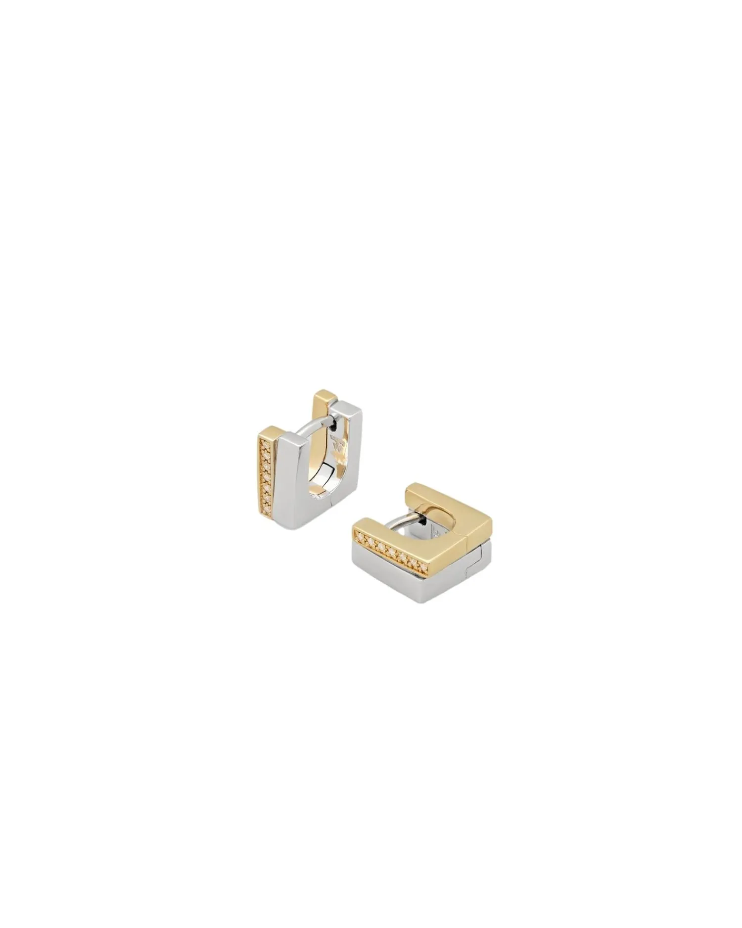 Moderne små øredobber i blanding mellom gull og sølv med små zirconia steiner.