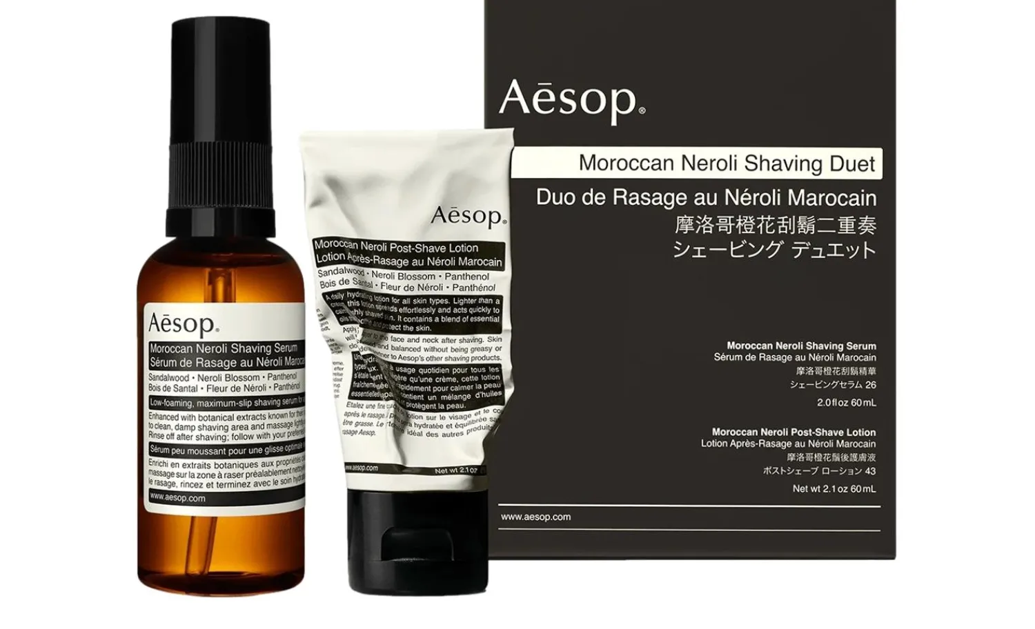 Består av «Moroccan Neroli Shaving Serum» og «Moroccan Neroli Post-Shave Lotion»