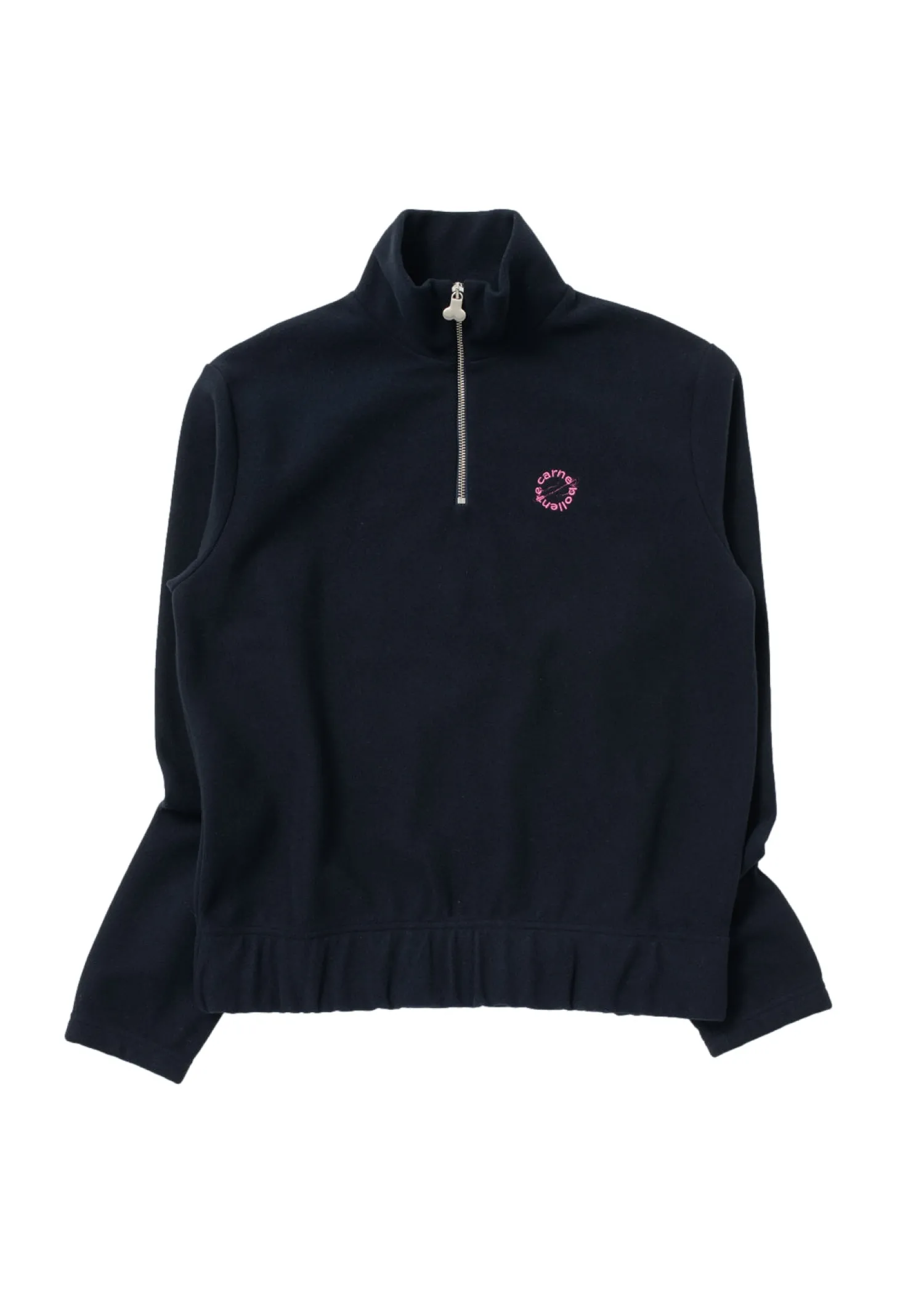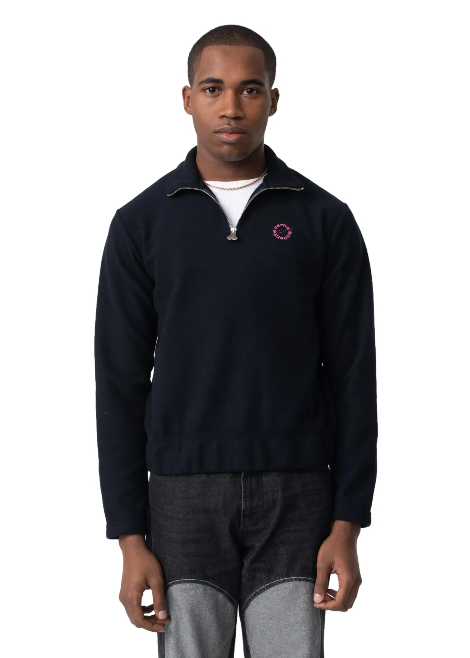 Fleecegenser med zip i halsen, delvis høy hals og lange ermer.
