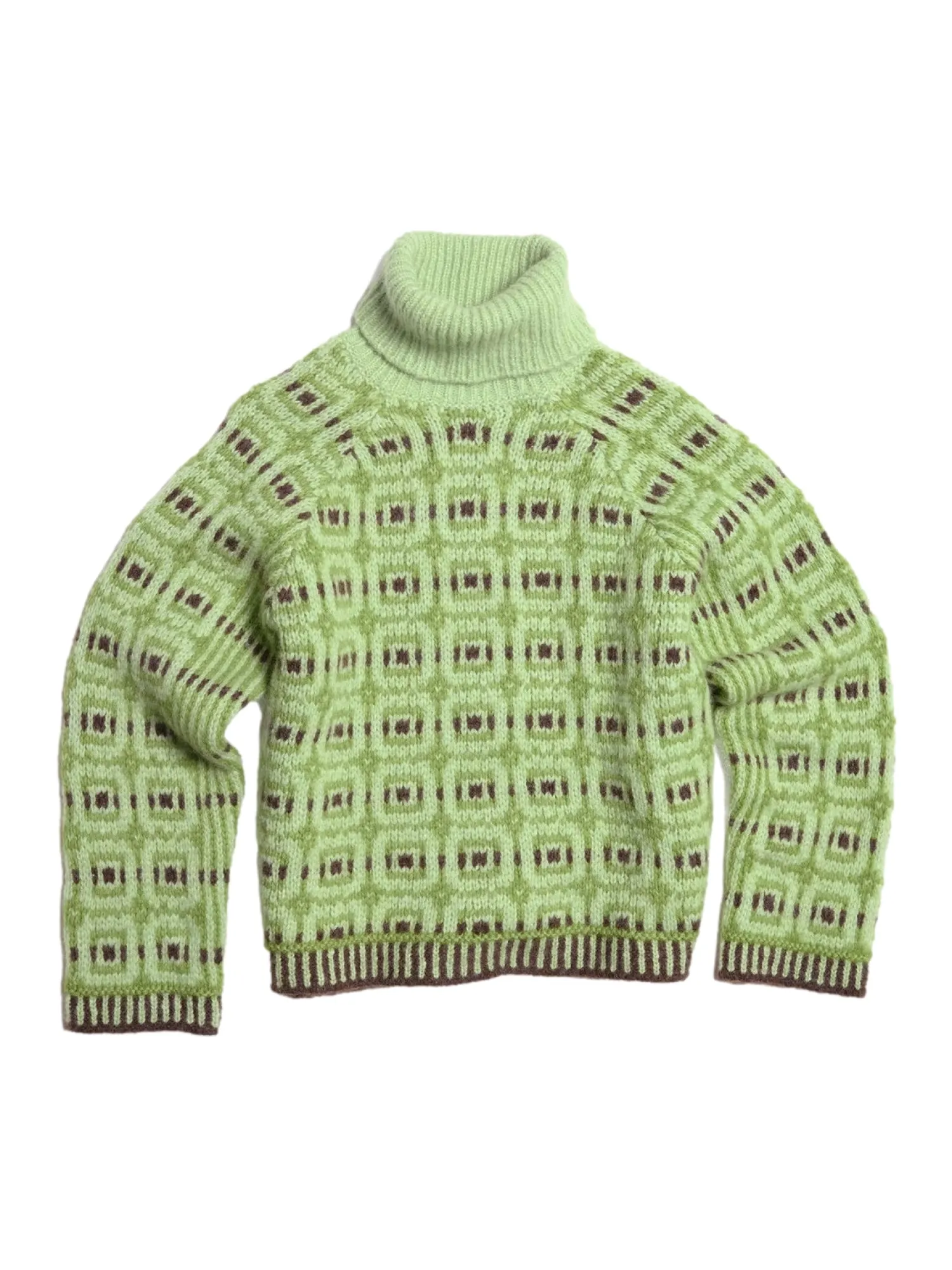 Høyhalset genser i norsk ull er designet i samarbeid med Skappel. Laget av myk norsk lammeull med et heldekkende intarsiamønster, har den en firkantet silhuett med en avslappet passform.