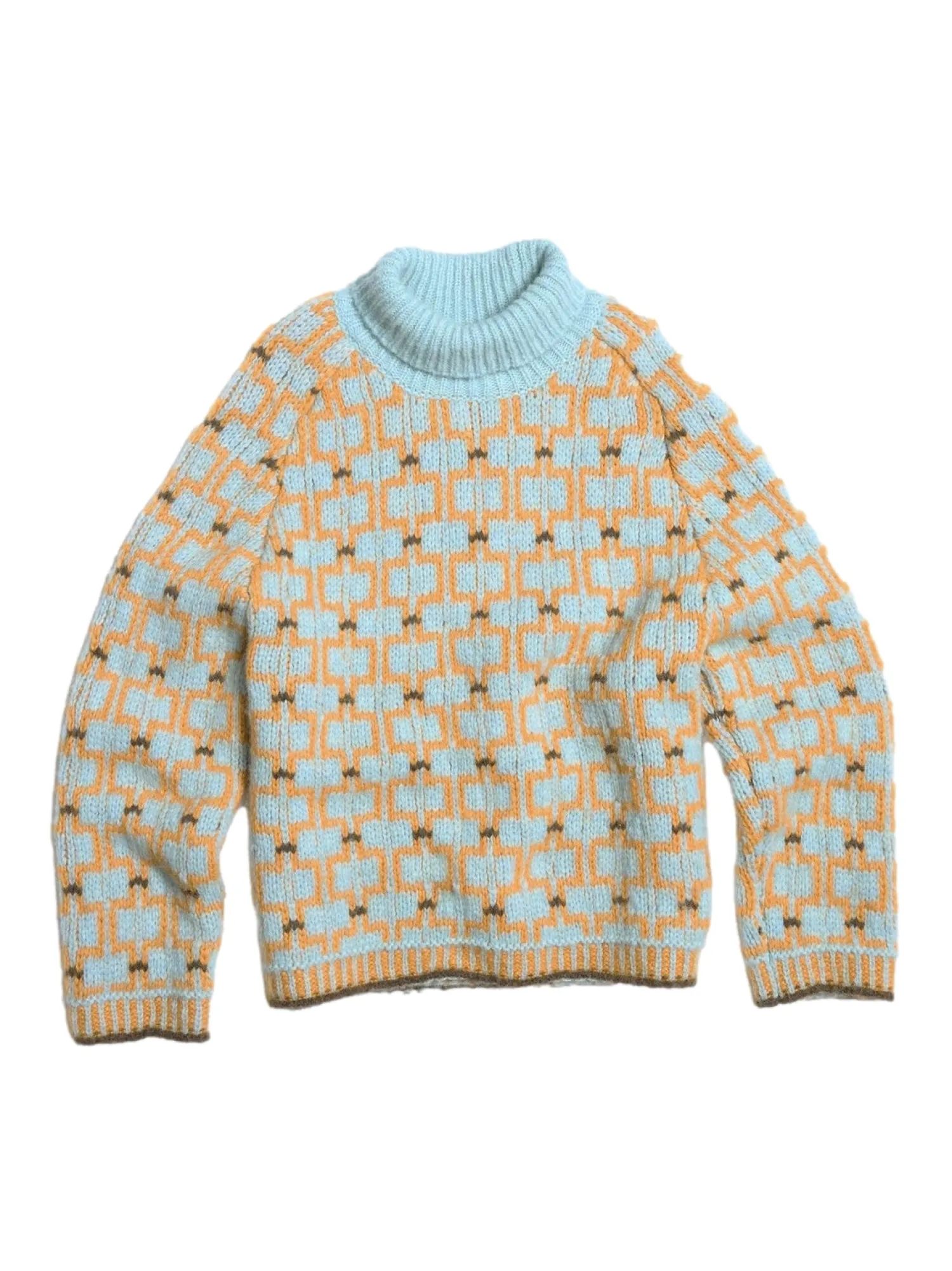 Høyhalset genser i norsk ull er designet i samarbeid med Skappel. Laget av myk norsk lammeull med et heldekkende intarsiamønster, har den en firkantet silhuett med en avslappet passform.