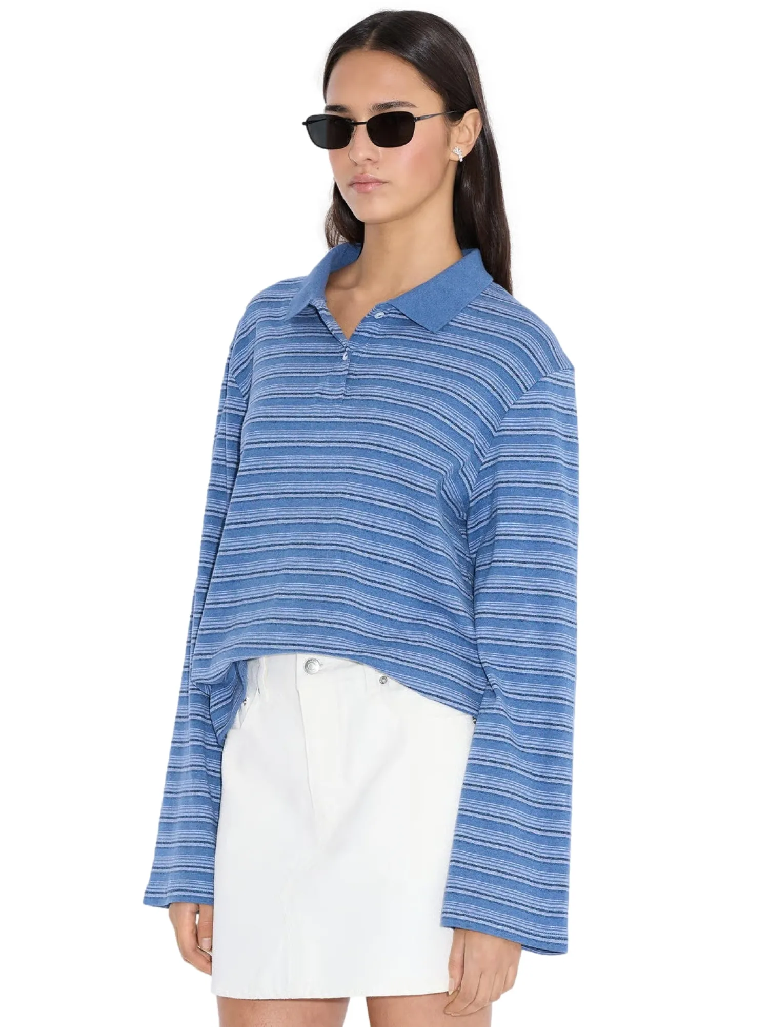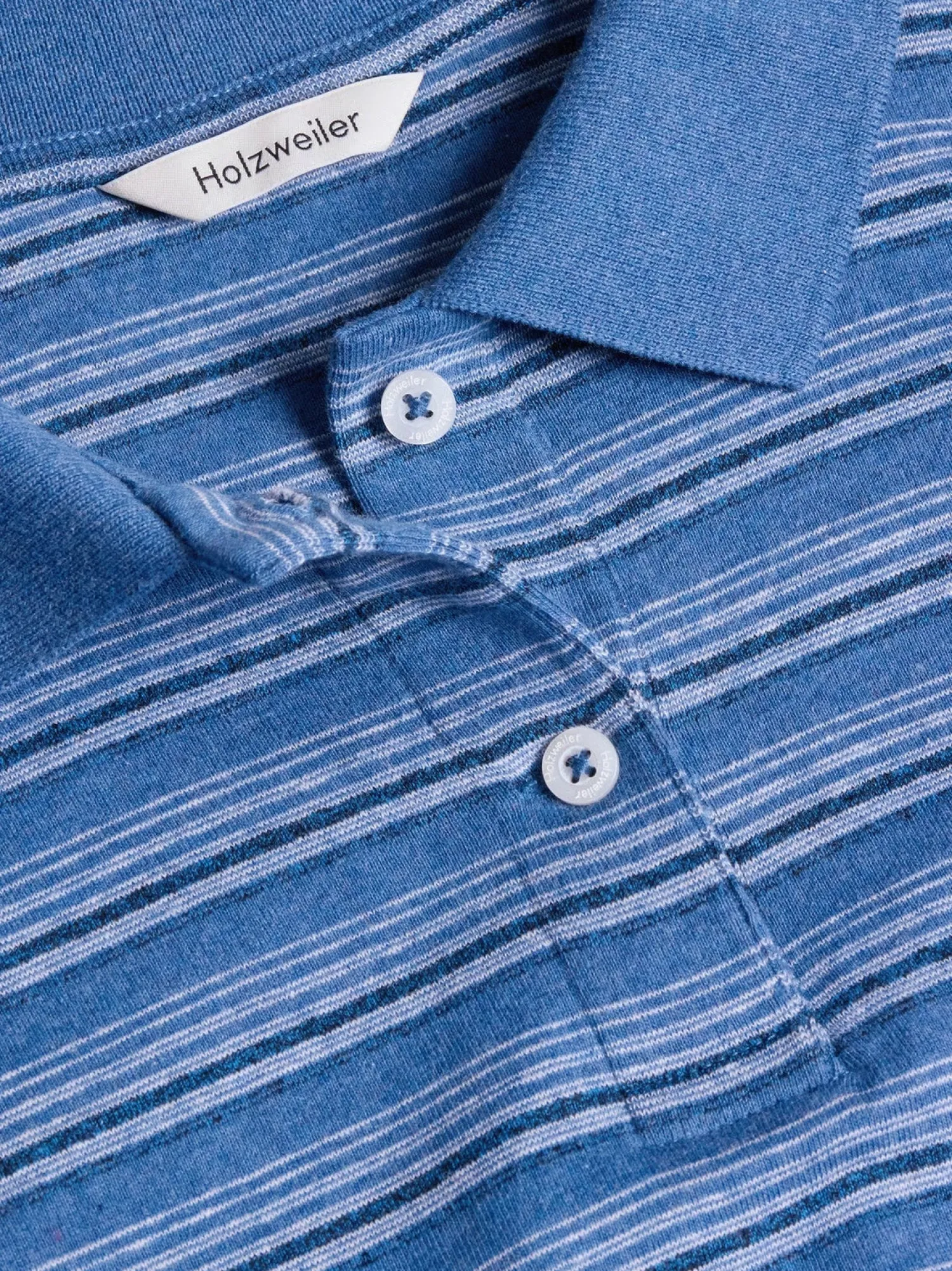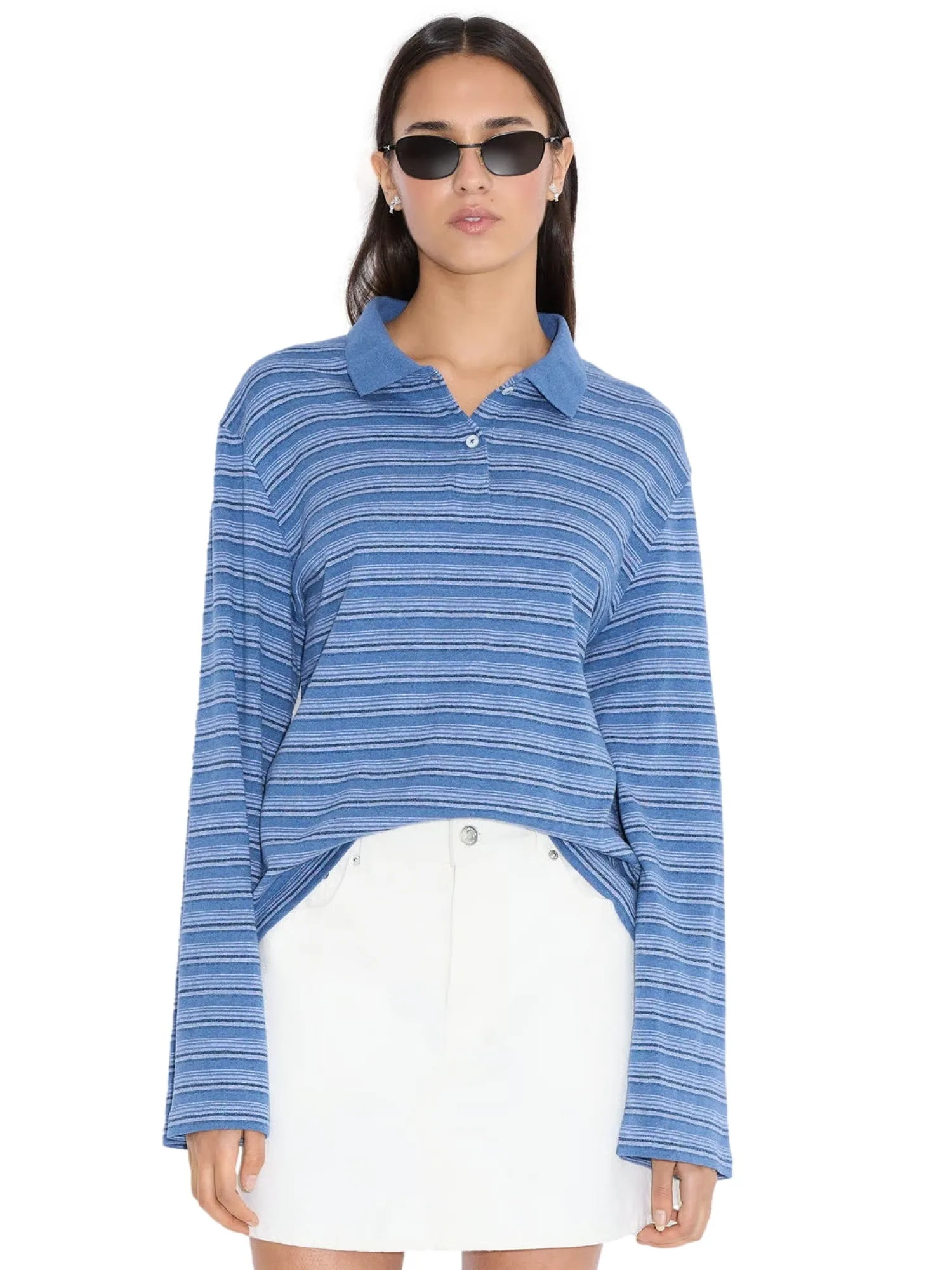 Sunny-poloen er laget av pustende, stripete bomull, og har en avslappet passform som er behagelig i varmt vær. Den har klokkeermer og en klassisk polokrage med knapp.