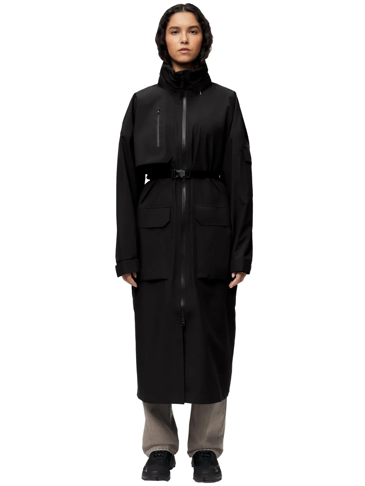 Lang elegant frakk med hette i vann- og vindavvisende stoff.