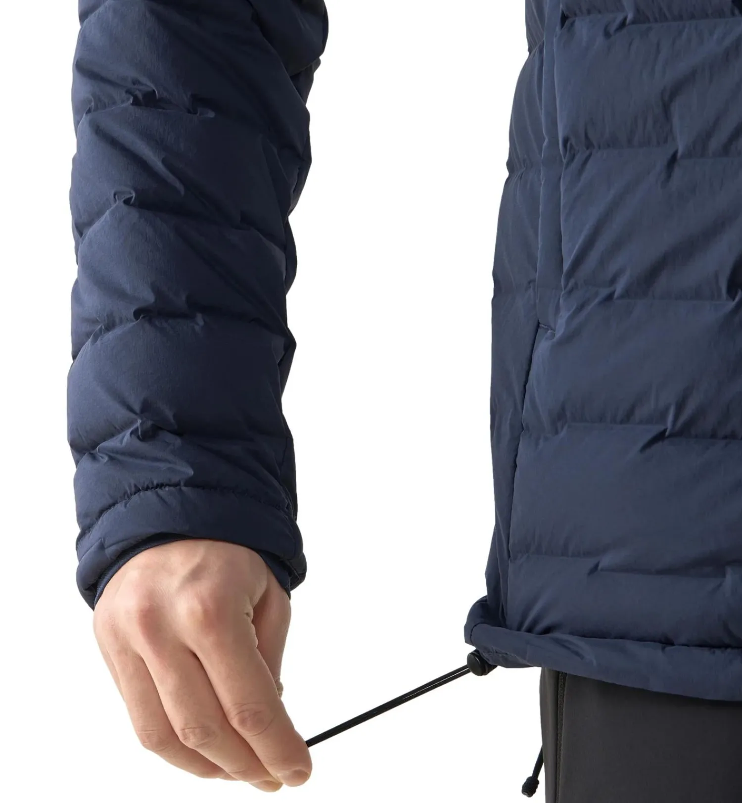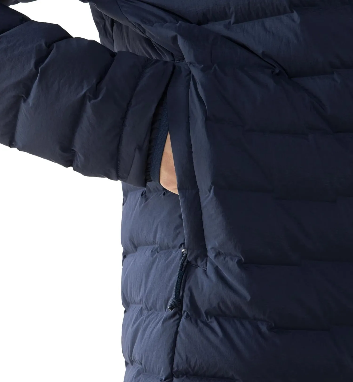 En elastisk hettegenser med dun som gir stabil varme i våte fjellforhold. Den er designet med fokus på kravene ved fjellklatring og klatring. Den er laget av et tøft og vannavstøtende ytterstoff med toveis stretch og er fylt med H DOWN Platinum med 800 CUIN fyllevne, et hydrofobisk gåsedun som holder seg tørt i opptil 10 000 minutter med eksponering for våte forhold. Den høyteknologiske platekonstruksjonen forhindrer kalde flekker på effektivt vis, takket være det brede, forhåndsvevde og sømløse designet. Den er utstyrt med en isolert, hjelmkompatibel hette som gir maksimal beskyttelse.