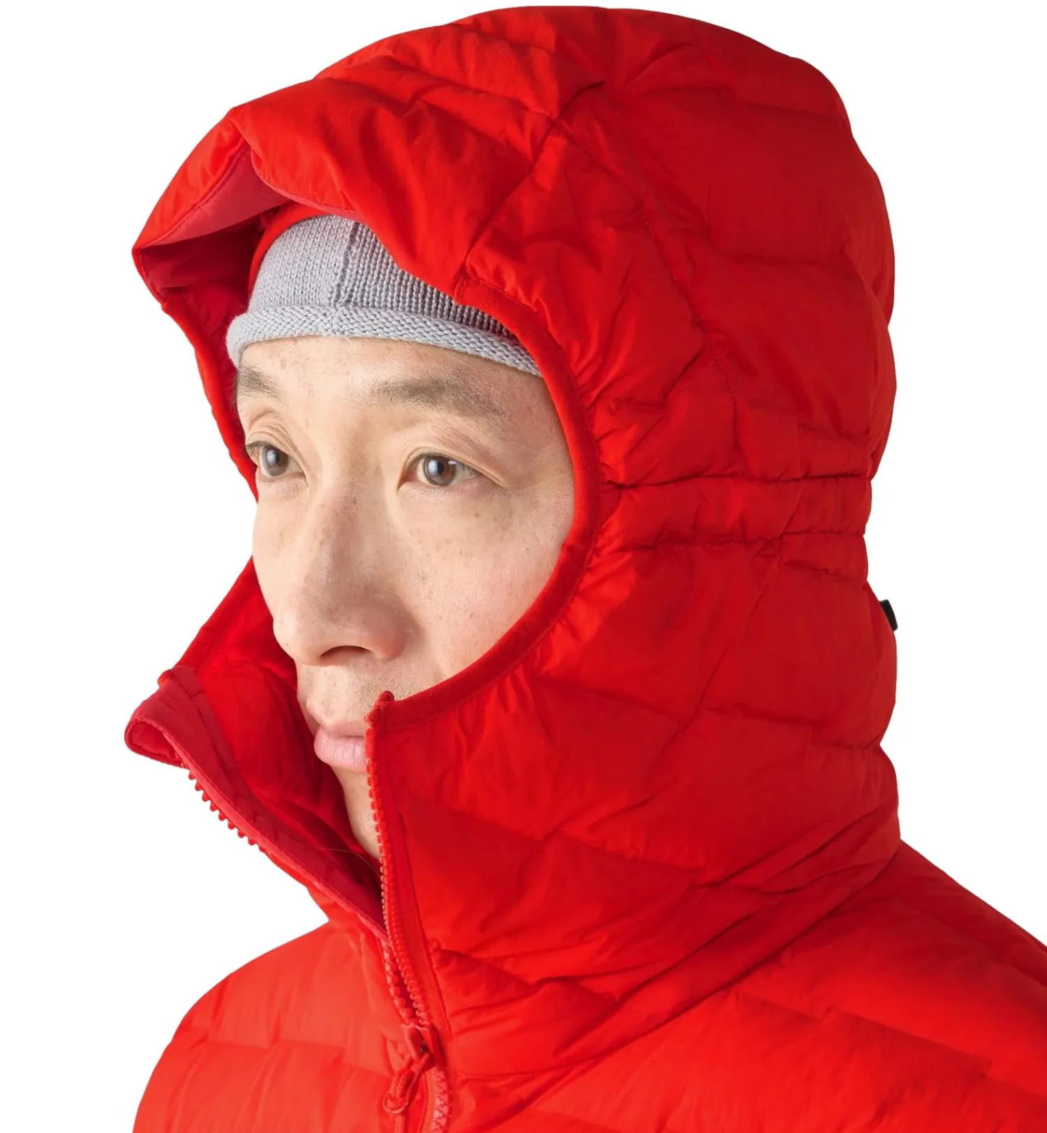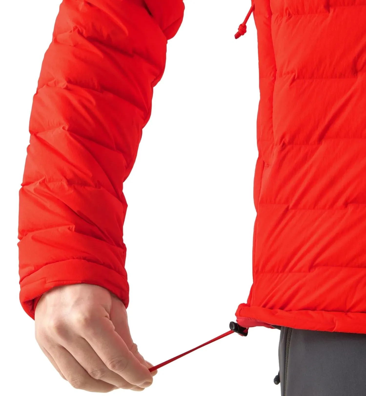 En elastisk hettegenser med dun som gir stabil varme i våte fjellforhold. Den er designet med fokus på kravene ved fjellklatring og klatring. Den er laget av et tøft og vannavstøtende ytterstoff med toveis stretch og er fylt med H DOWN Platinum med 800 CUIN fyllevne, et hydrofobisk gåsedun som holder seg tørt i opptil 10 000 minutter med eksponering for våte forhold. Den høyteknologiske platekonstruksjonen forhindrer kalde flekker på effektivt vis, takket være det brede, forhåndsvevde og sømløse designet. Den er utstyrt med en isolert, hjelmkompatibel hette som gir maksimal beskyttelse.