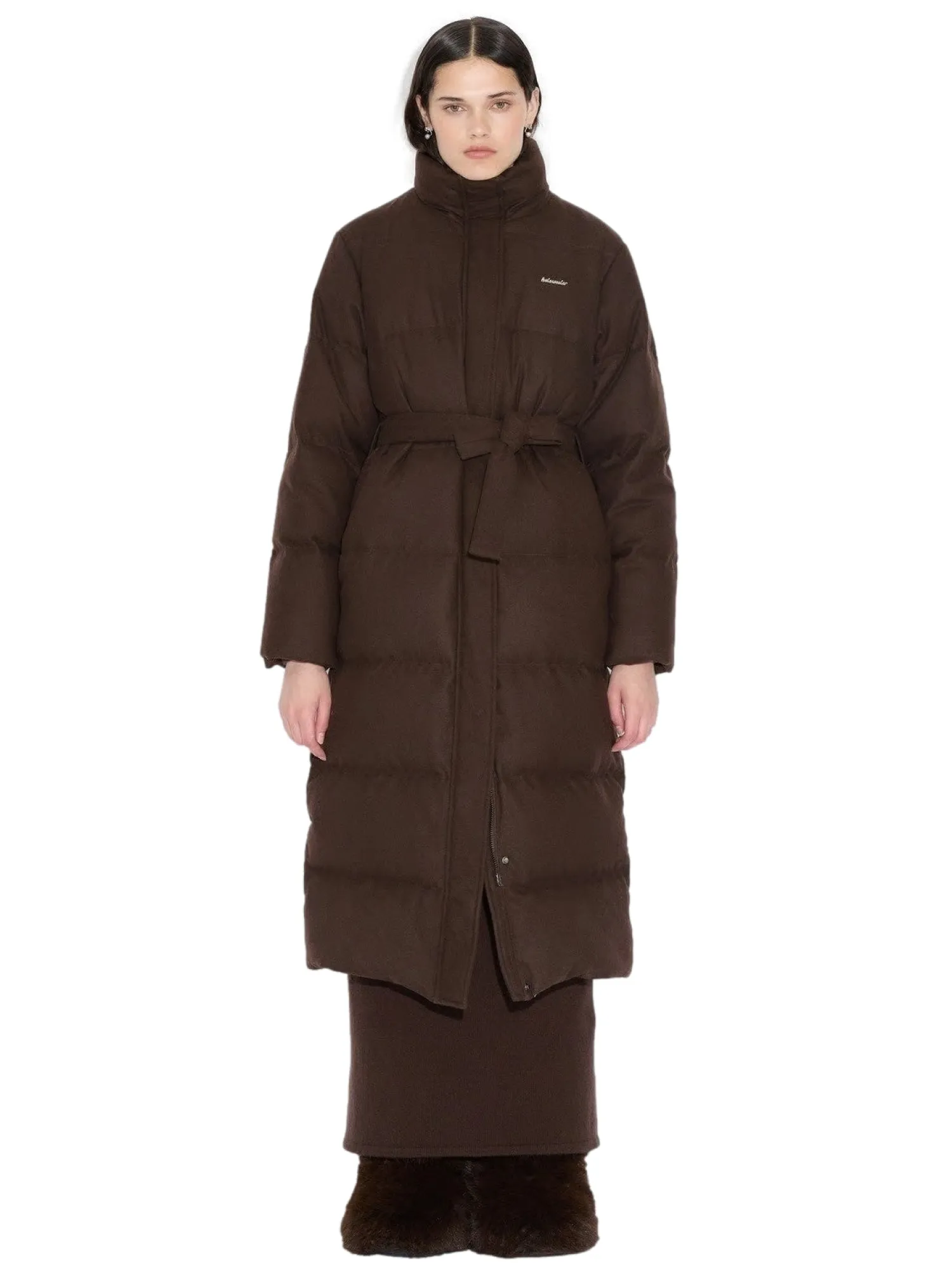 Med en kant som går under kneet og knyteløs midje kan Tech Wool-dunfrakken brukes over kveldstøy for optimal isolasjon. Laget av en teknisk ullblanding og vattert med dun, tilbyr dette designet tekniske funksjoner som inner- og utvendige lommer med glidelås, toveis glidelås foran og høy hals. Den er toppet med en metalllogoplakett på brystet.