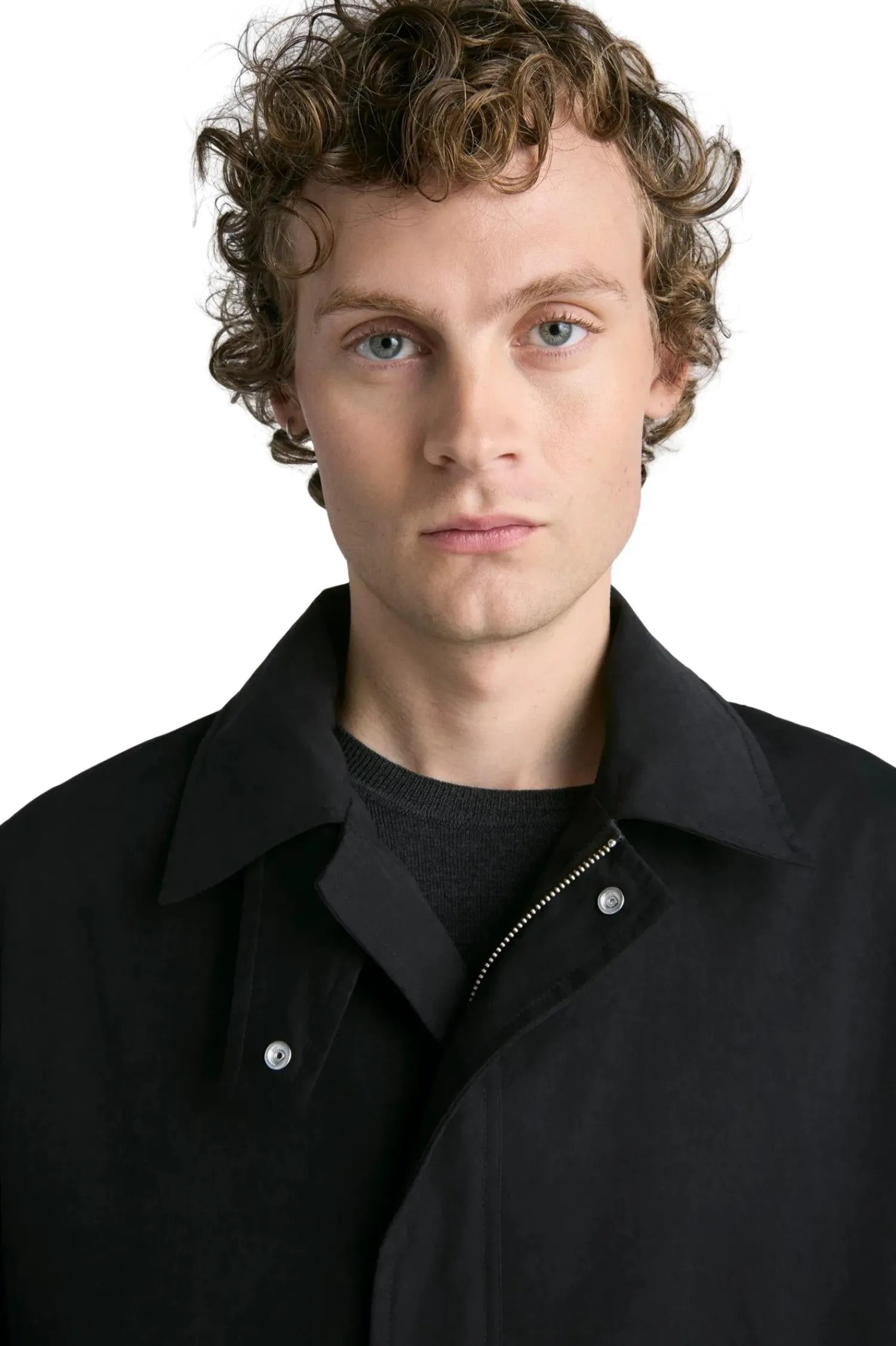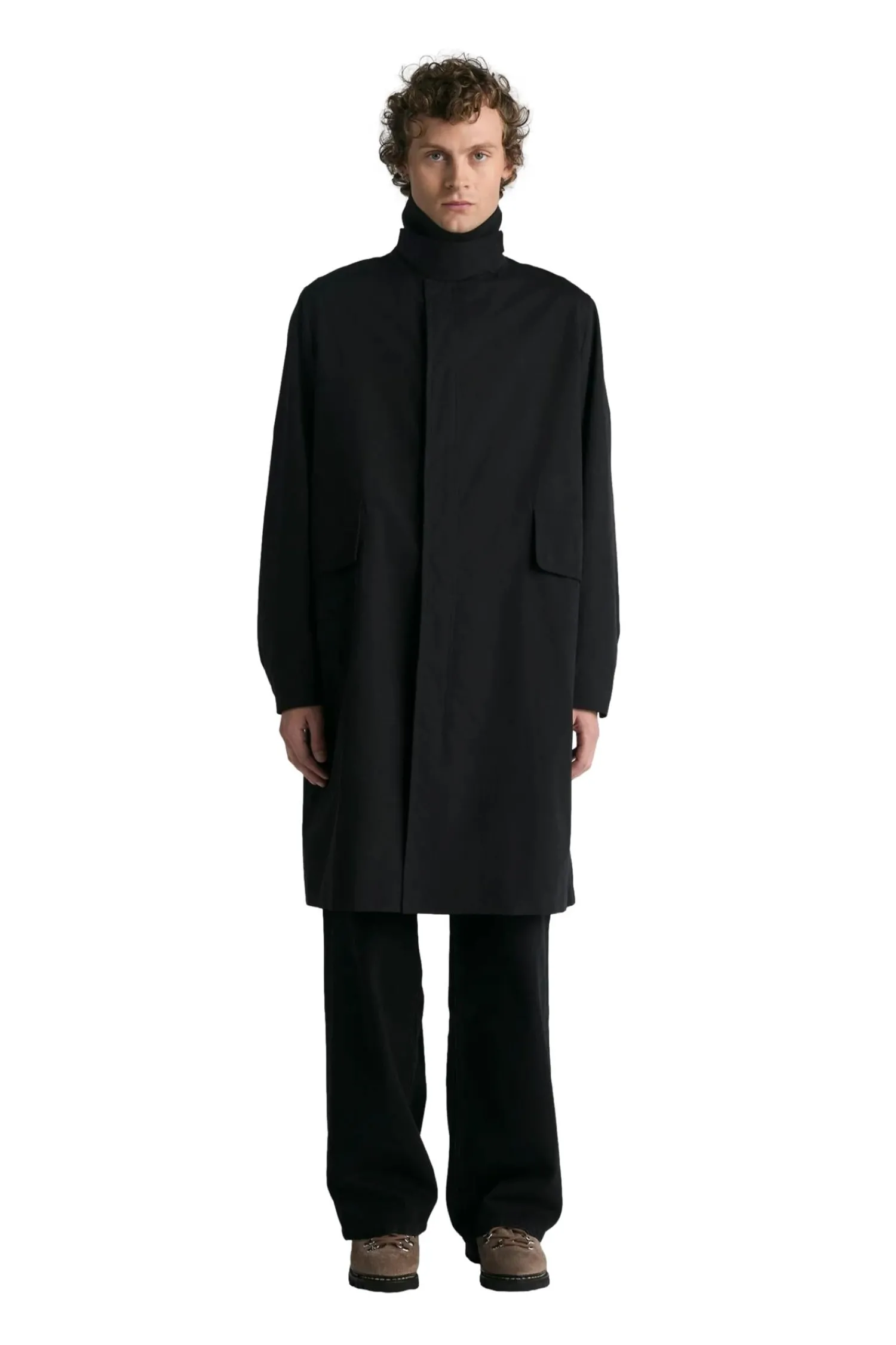 Den dristige silhuetten er avsluttet med en bred krage, en avtakbar halslås og to store klafflommer i midjen. Toveis glidelåslukking i full lengde, dekket av en klaff sikret med Riri-trykknapper.