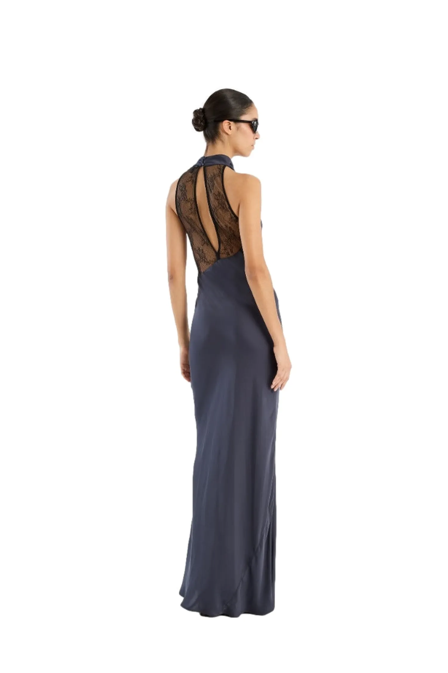 Lace Maxi Dress Dark Blue er en ermeløs halterneck-kjole med en lang, rett silhuett. Den har en mykt drapert front med rynker over bysten og en lav utskjæring bak med gjennomsiktige blondepaneler. Designet inkluderer en rynket søm nederst på ryggen og en delikat knappelukking i halsen.
