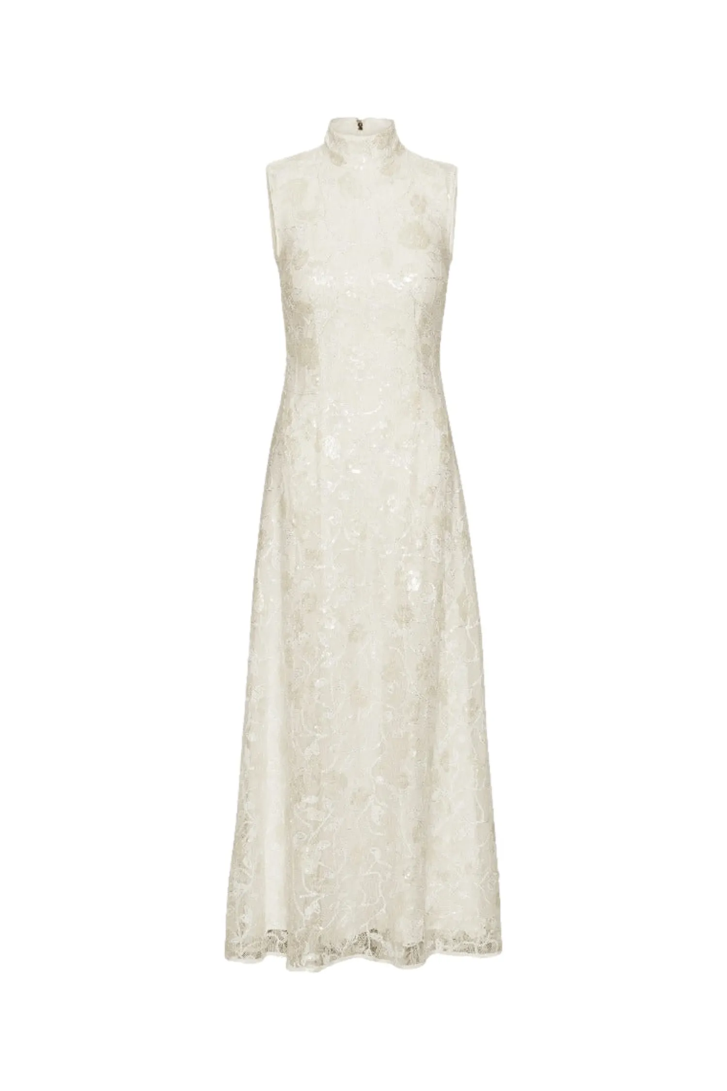 Lang ermeløs kjole med halvhøy hals i regular fit passform.