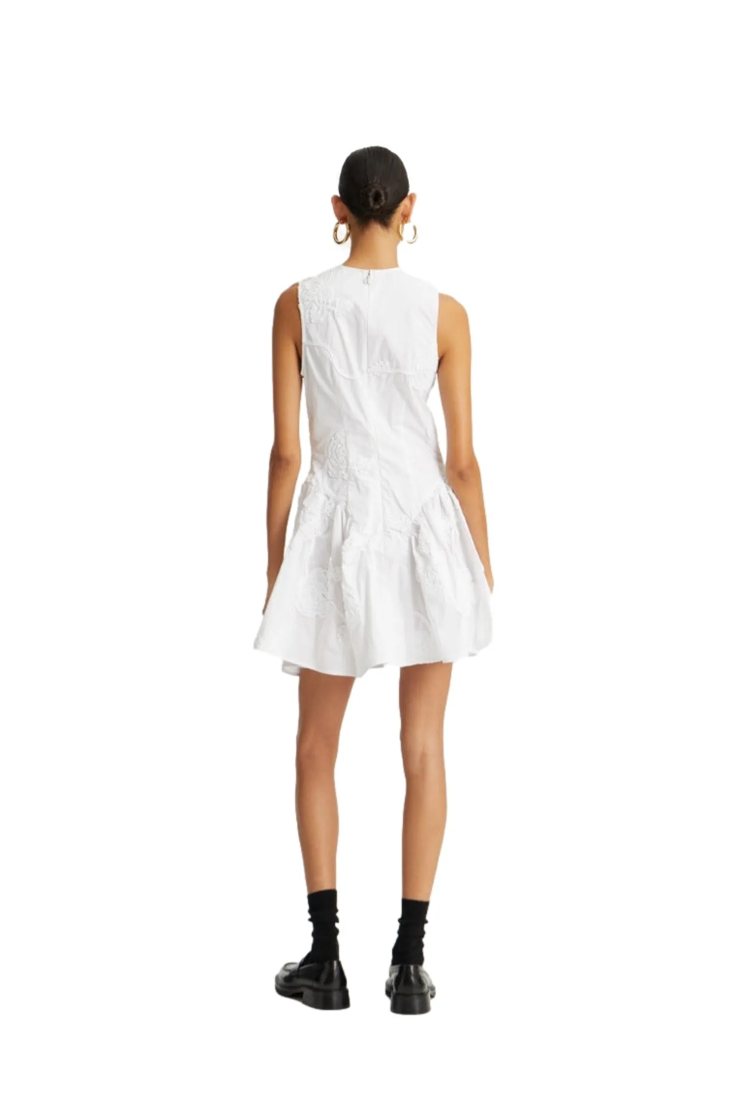 Poplin Mini Dress White har en tettsittende silhuett med rund hals og kort fald. En skjult glidelås eller åpning bak sikrer enkel lukking, mens kantene er pent avrundet.