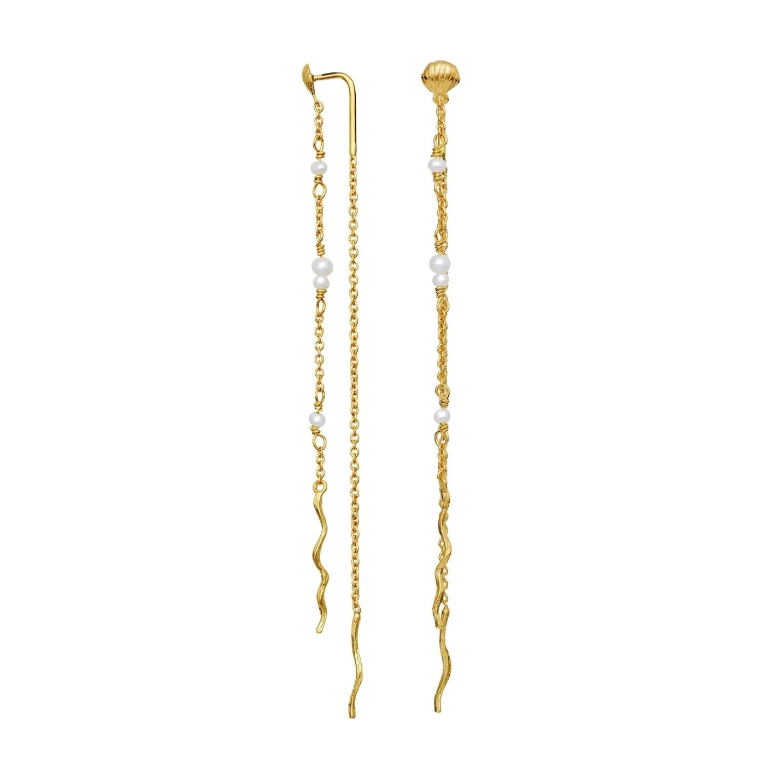 Lange kjeder faller elegant fra Sirena øreringen som en liten vannstråle fra øreflippen, langs halsen, med små glimt fra dråper fra ferskvannsperler.