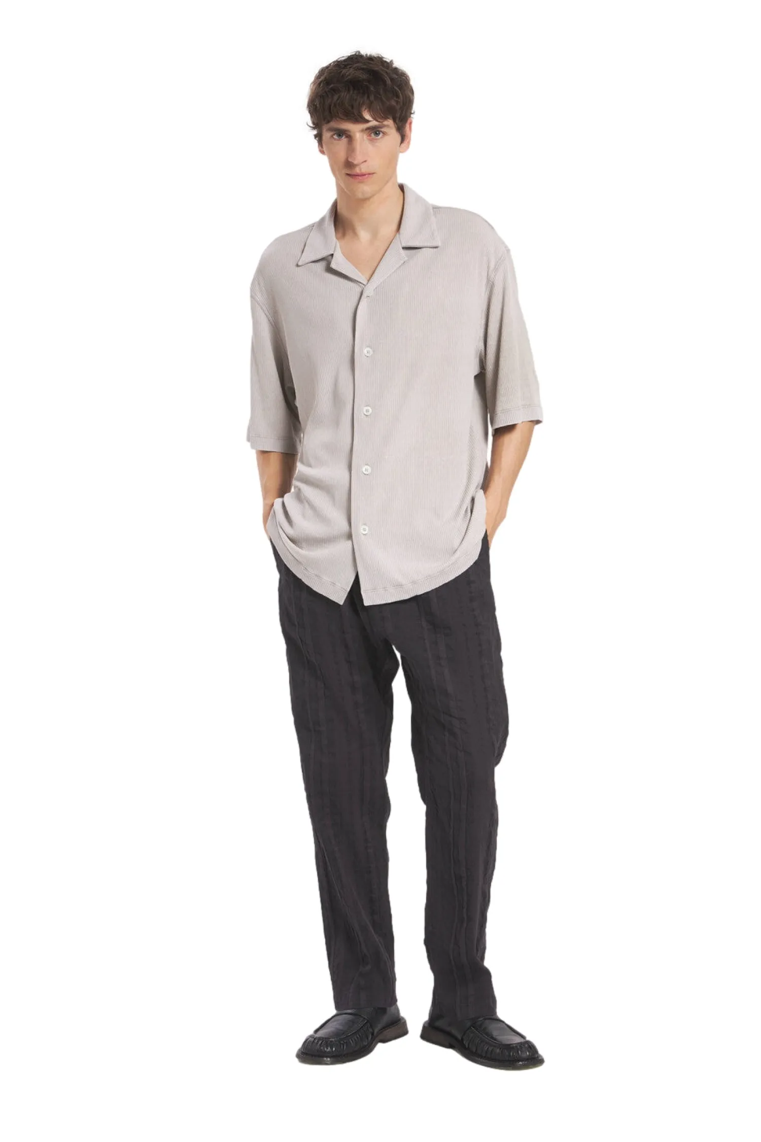 Laget av 77% bomull, 19% lin og 4% elastan.