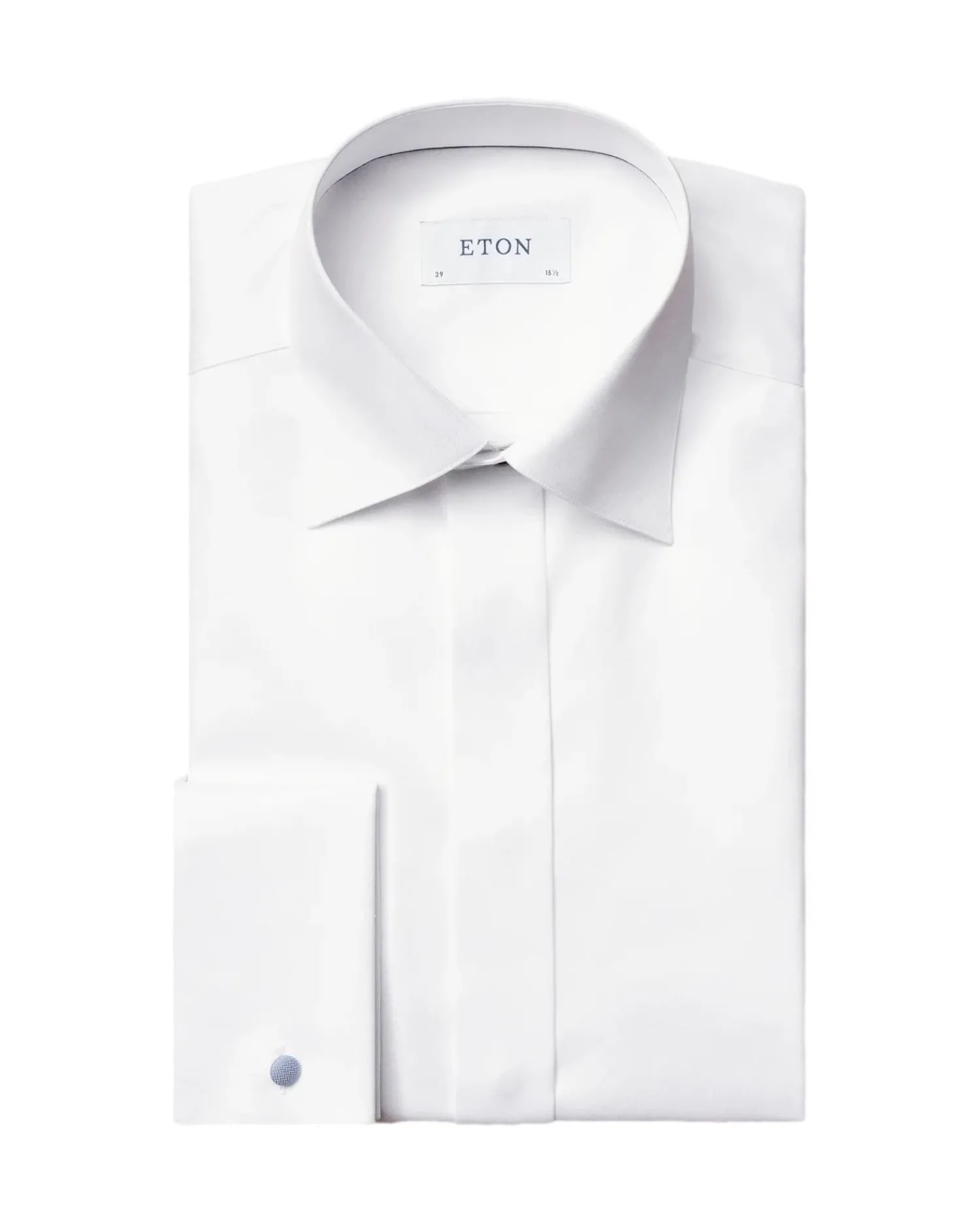 Skjult knappestilling og fransk dobbelmansjett. Cut away krage.