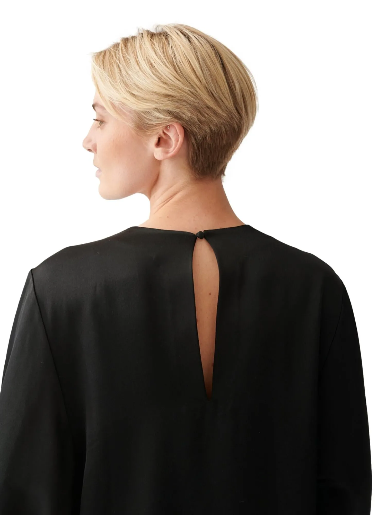 Bluse med rund hals og lange puffete vide ermer.