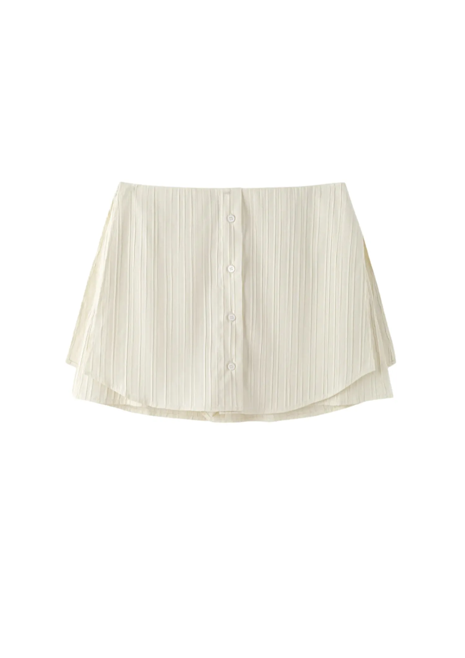 Dette teksturerte stripete korte skjørtet har et subtilt vertikalt linjemønster som gir stoffet visuell interesse. Fronten er knappet opp med små hvite knapper, som skaper en illusjon av en skjorte underdel.