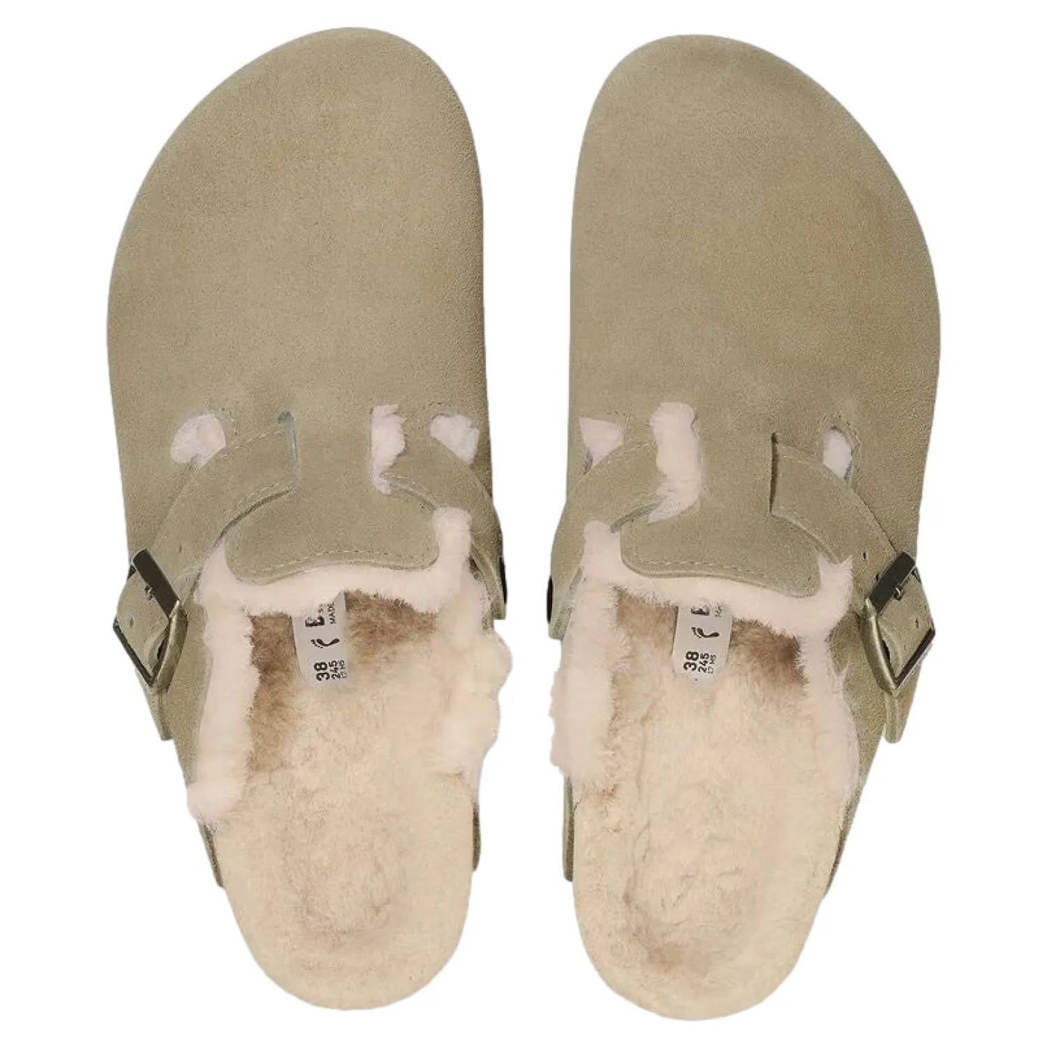 Helst i en klasse for seg! Treskoen Boston, en klassiker blant BIRKENSTOCK-modellene viser seg her frem i en spesielt god variant i ekte semsket skinn med svært høy kvalitet. Den naturlige lammefellsdekksålen og reimene som er underfôret med lammefell, virker stilige og sørger for varme føtter. Den egnede skoen for koselige vinterkvelder ved kaminen!