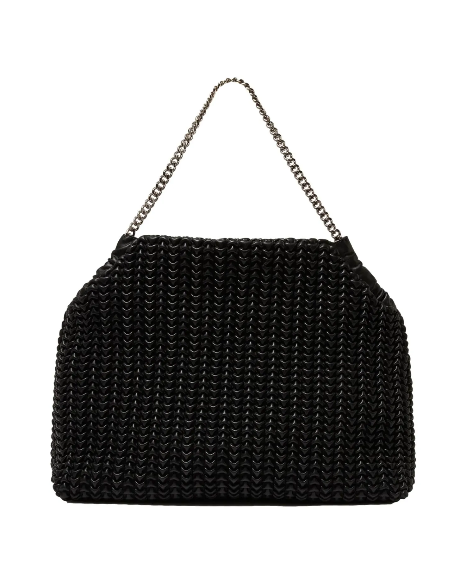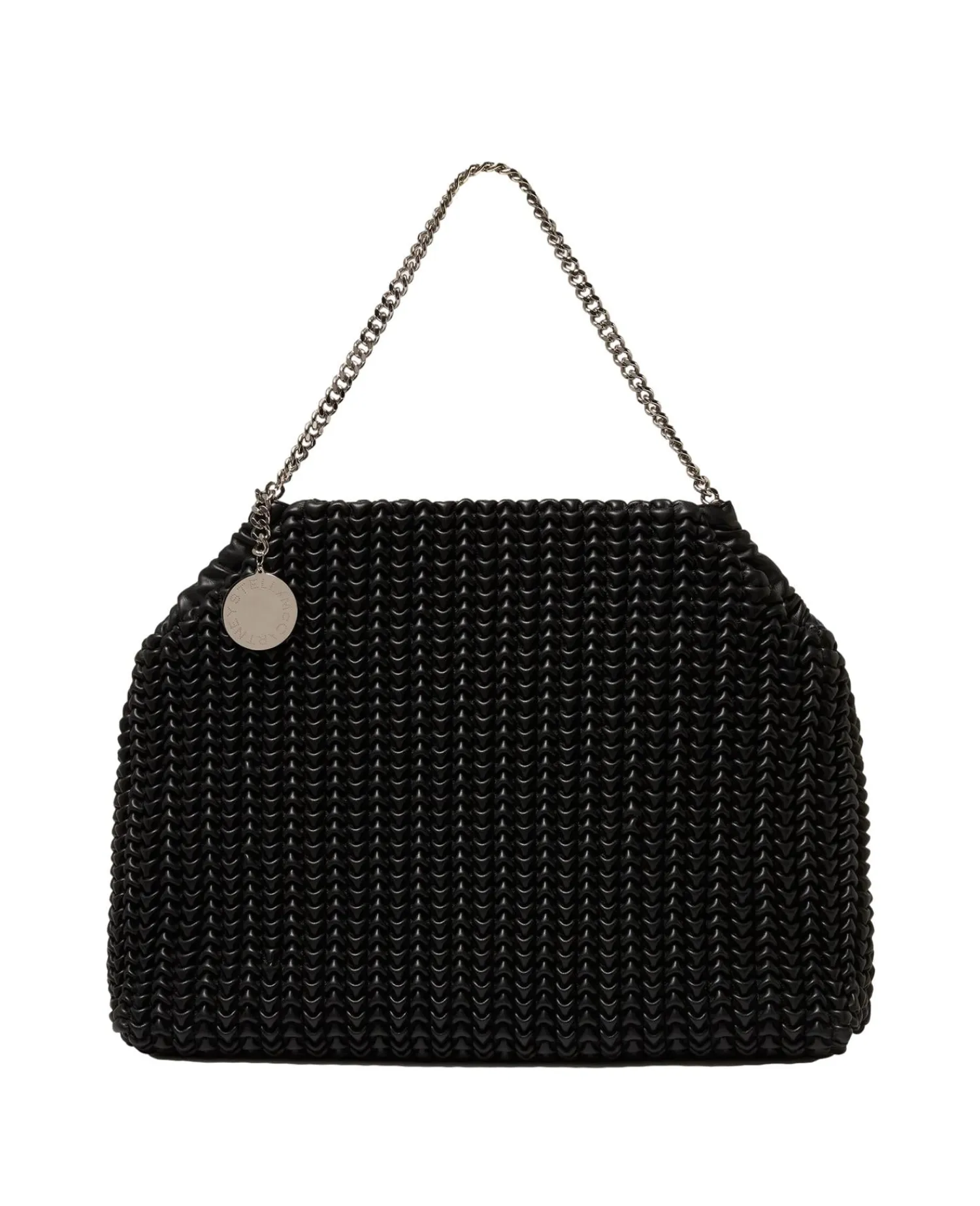 Den nye Falabella-vesken med snøring gir et nytt preg av vårt veganske ikon, med en tett, bølget popcorntekstur over det hele. En signaturkjede i diamantslipt resirkulert messing og resirkulerbar aluminium fungerer som skulderstropp, med nok plass til telefon, lommebok og andre nødvendige ting. Fullfôret med monogrammerket resirkulert stoff, bær den over skulderen for et klassisk hverdagsantrekk.