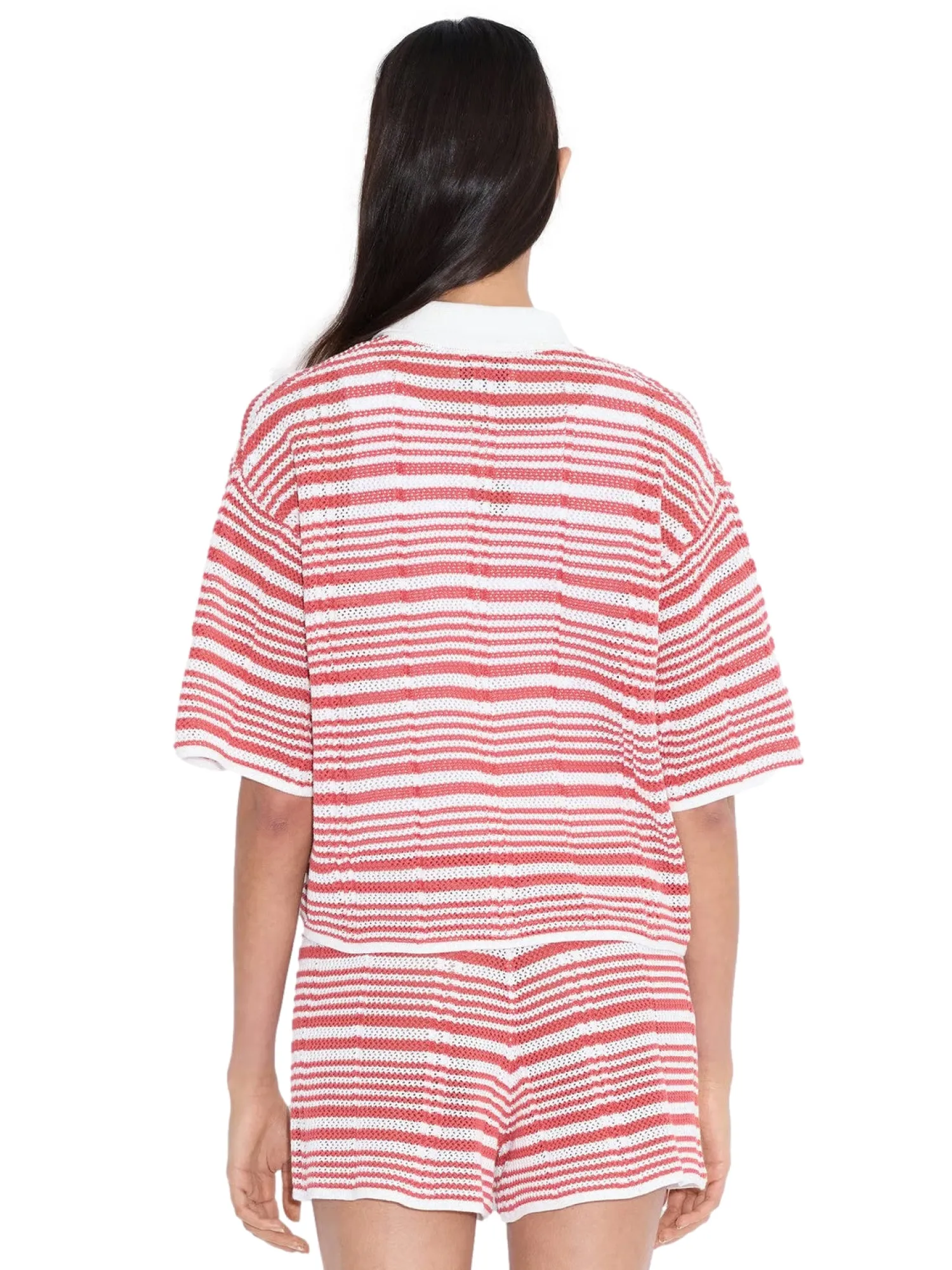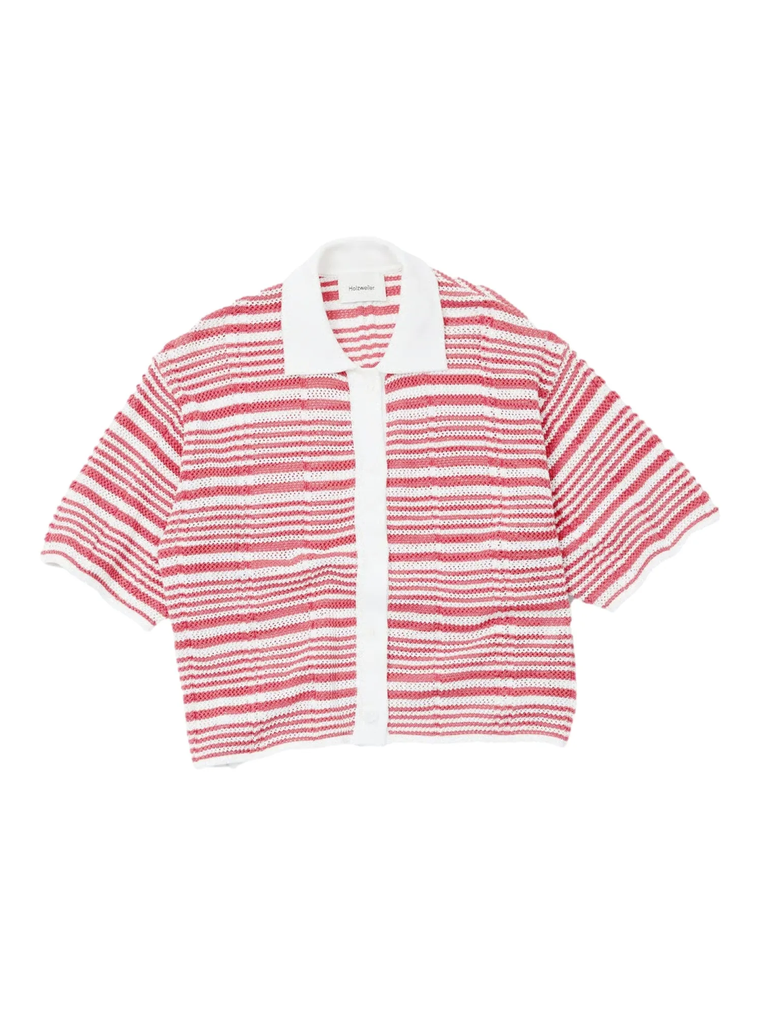 Kelp Striped-skjorten er laget av ren økologisk bomull i heklestrikk. En kortermet stil med oversized passform, den har en klassisk krage og en knappestolpe foran. Style med den matchende Kelp Striped-shortsen.