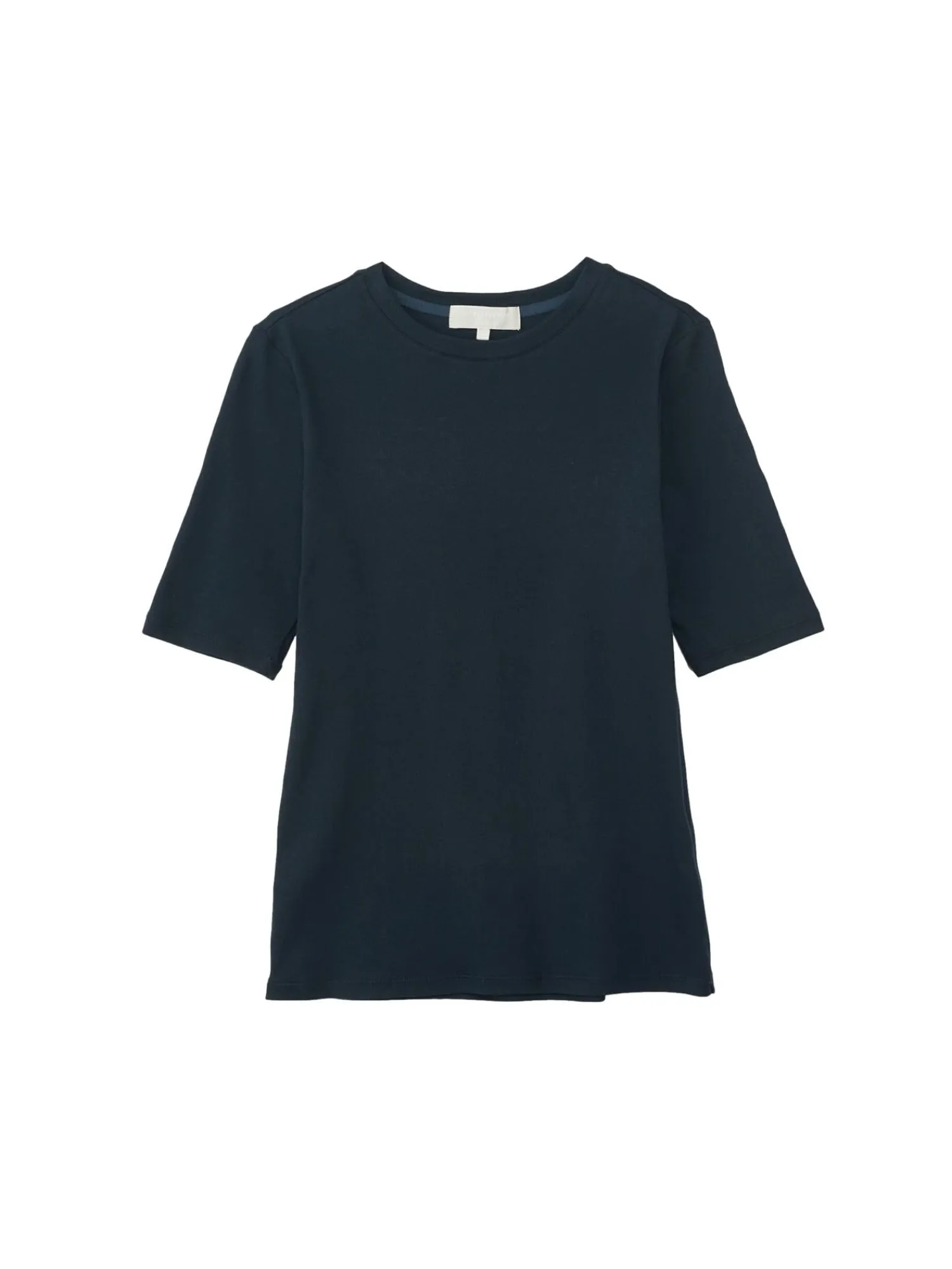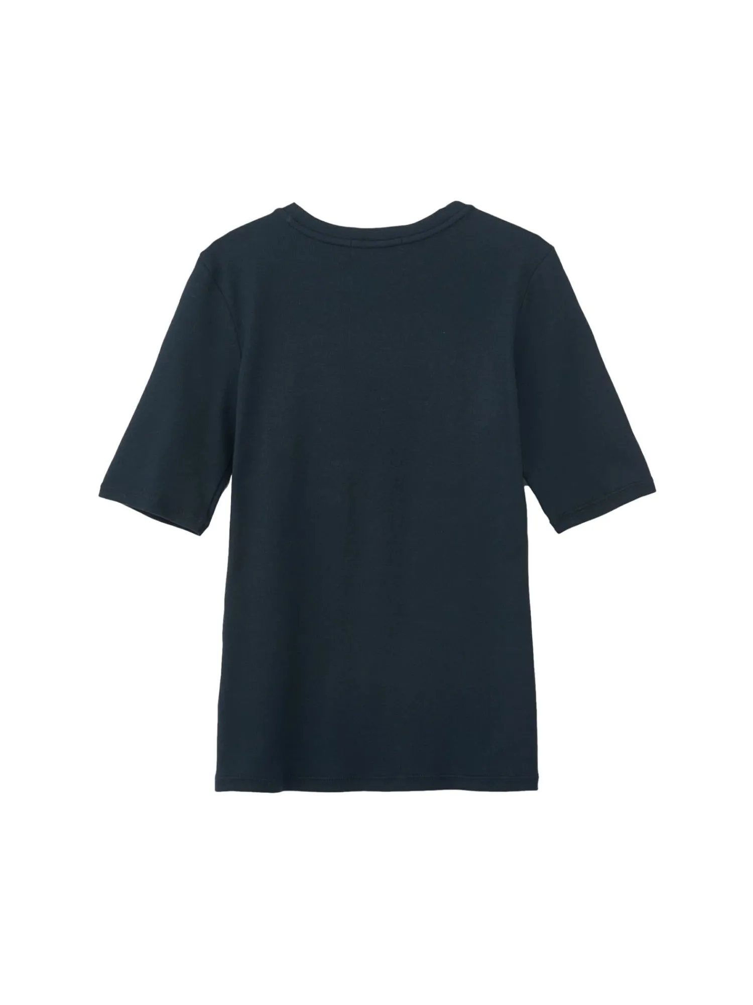 Ribbet t-skjorte med 3/4 lange ermer, rund hals og smal, men elastisk passform.